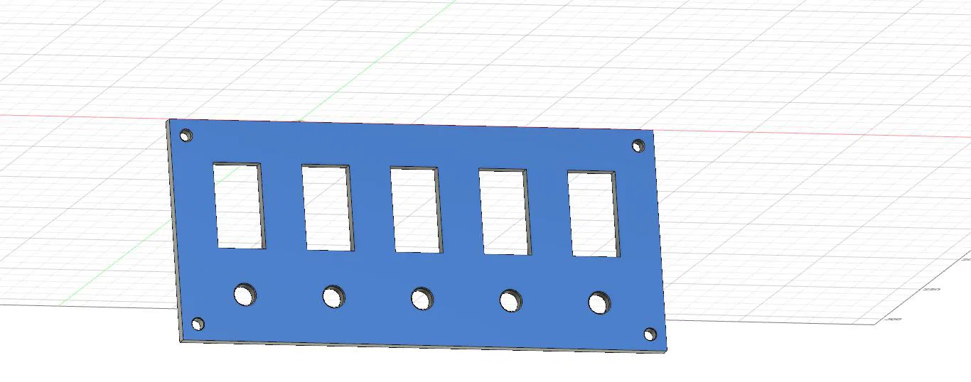 Bảng công tắc bật tắt 5 băng đơn giản, có lỗ cho bộ ngắt mạch dạng nút nhấn. Kích thước vừa với công tắc kiểu Carling, 21mm x 37mm. Có thể in bằng PLA hoặc ASA. Điều chỉnh cài đặt in phù hợp với môi trường sử dụng khắc nghiệt.