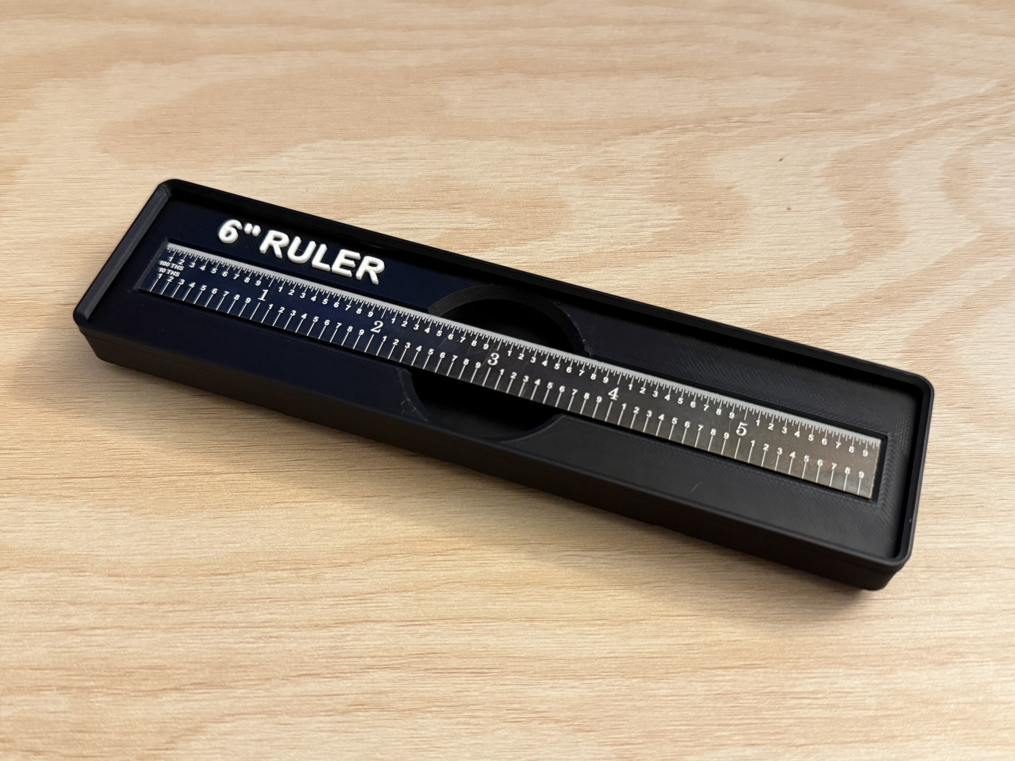 Hộp Gridfinity 4x1 dành cho thước thép 6 x 0.5 inch của Starrett hoặc Products Engineering. Có chữ nổi 1 mm để in multicolor, và phần thước đặt chìm 2 mm giúp không bị trượt khi đóng/mở ngăn kéo.