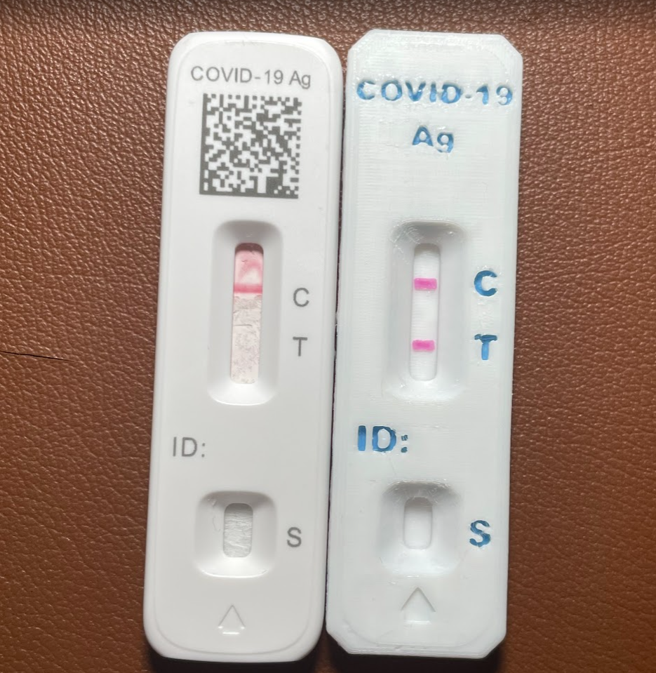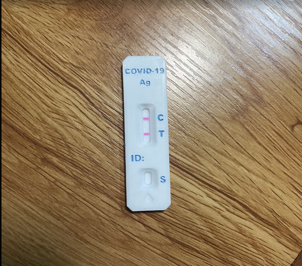 Đây là một mẫu 3D in nhiều màu mô phỏng que test nhanh COVID-19 cho kết quả dương tính. In bằng PLA màu trắng, magenta và xanh dương.