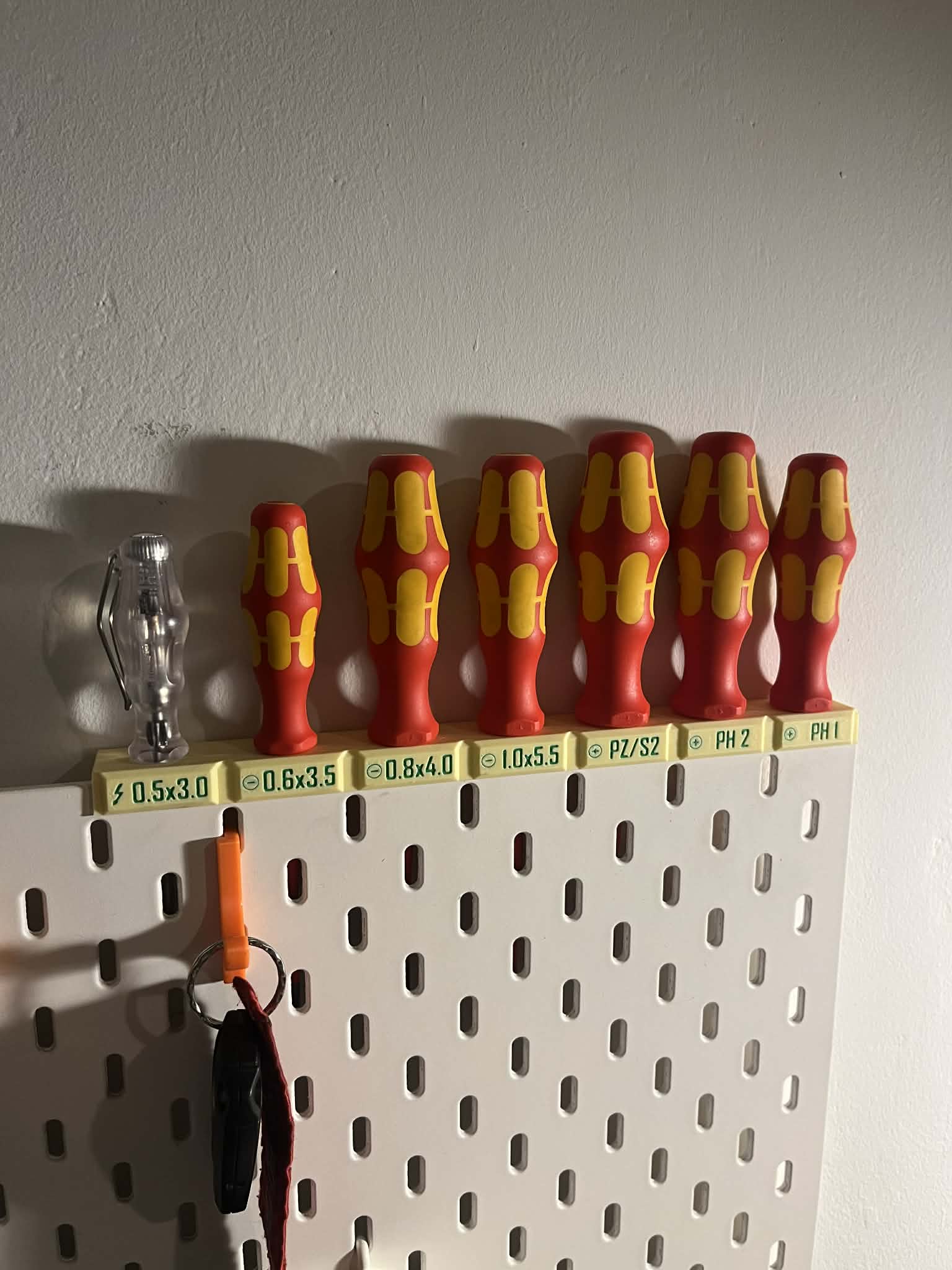 Giá/holder cho bộ Wera VDE 7 món (Wera 05006480001), gắn được lên bảng Skadis (M4), gắn trên đỉnh bảng hoặc treo tường. Bản treo tường dài hơn 5 mm để rút dụng cụ dễ hơn.