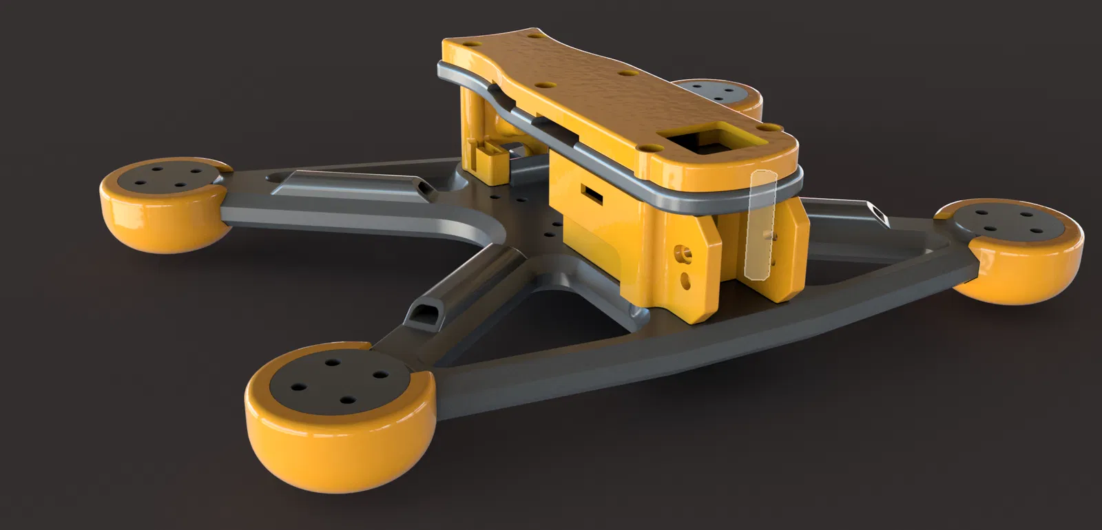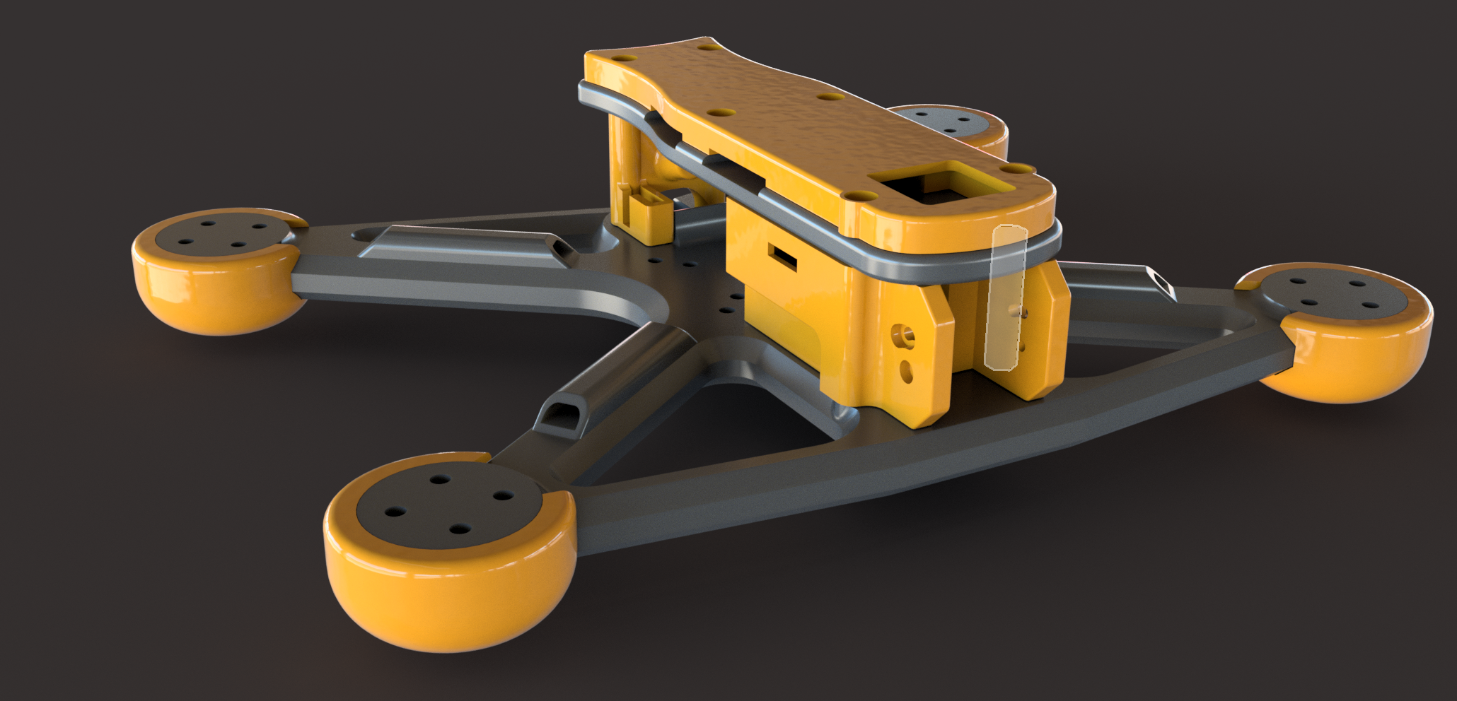 Mình dùng PA12-cf cho khung và phần “mái” (toit). 3 walls và infill 20% là dư xài cho vật liệu này (khung cực kỳ cứng). Nếu bạn in PETG thì có thể cần tăng lên chút. Mình chưa thử PLA nhưng mình nghĩ vẫn có thể chạy được vì tay drone khá dày.