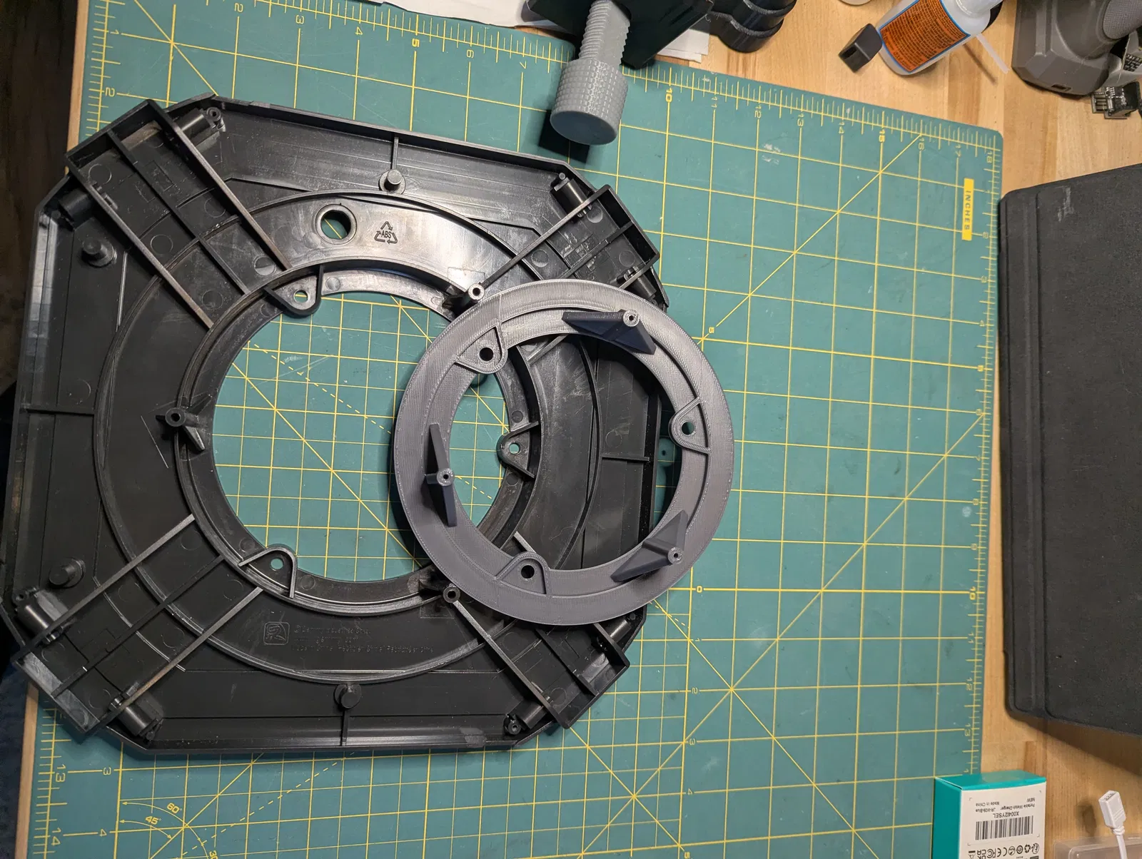 Kích thước bên ngoài và phần chân của các đế Gemmy là giống nhau cho mọi cỡ quạt, nhưng vòng (interior ring) bên trong và các ngàm/kết nối (connectors) cho quạt và protective base plate thì khác nhau. Mình tìm được stand cho quạt lớn trên mạng nhưng lại không thấy loại cho quạt nhỏ. Vì vậy mình thiết kế miếng adapter này để lắp vừa vào bên trong vòng lớn.