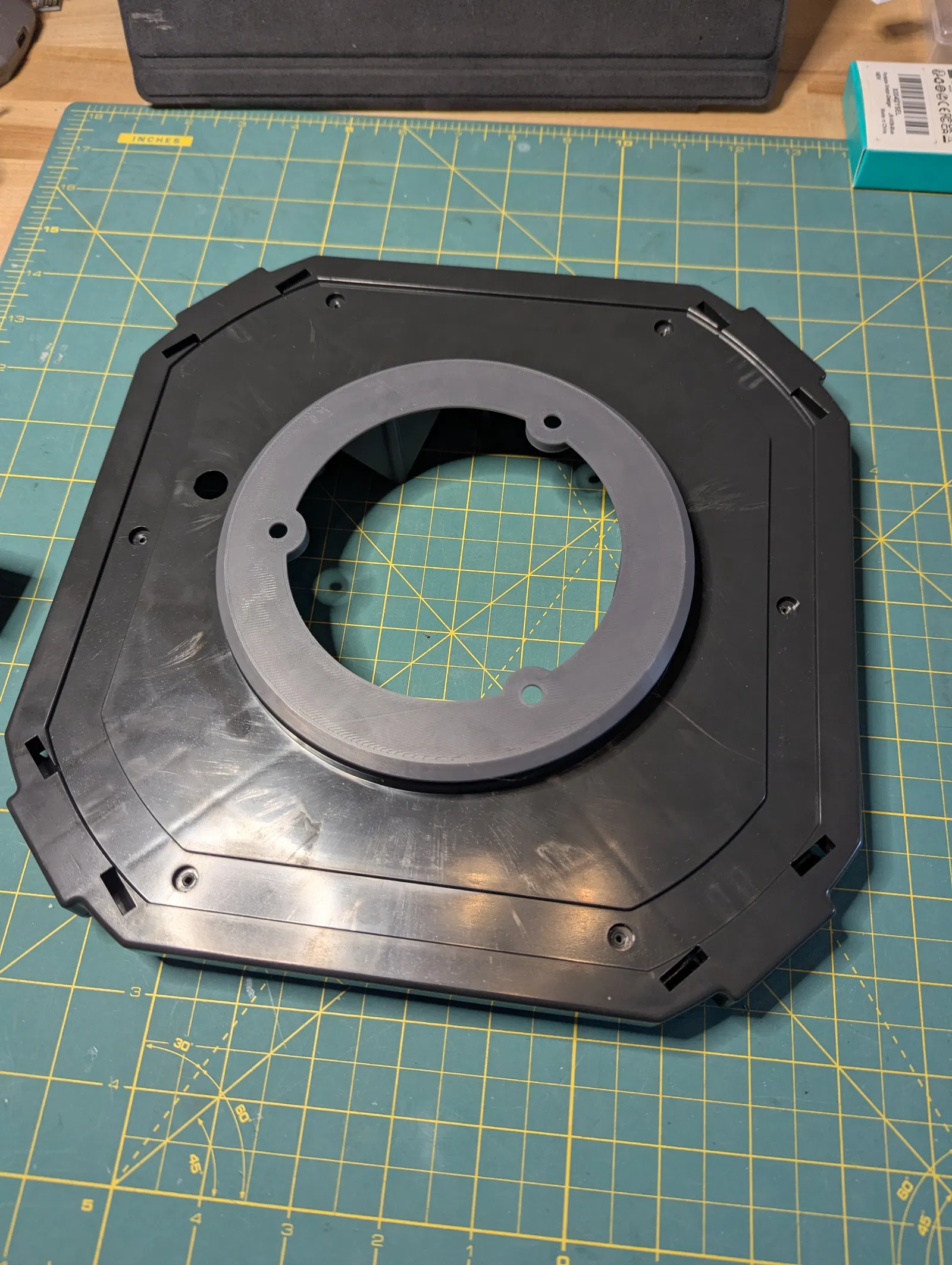 4 lỗ quanh phần viền ngoài, cần dùng vít hoặc bu-lông nhỏ để cố định adapter vào đế lớn. Mình dùng vít #8 x 1/2" loại self-drilling Phillips head. Loại này cho phép tự khoan vào đế bằng chính con vít. Nhưng bạn có thể dùng bất kỳ vít #8 nào có chiều dài tương đương, miễn là bạn khoan mồi lỗ trên đế trước.