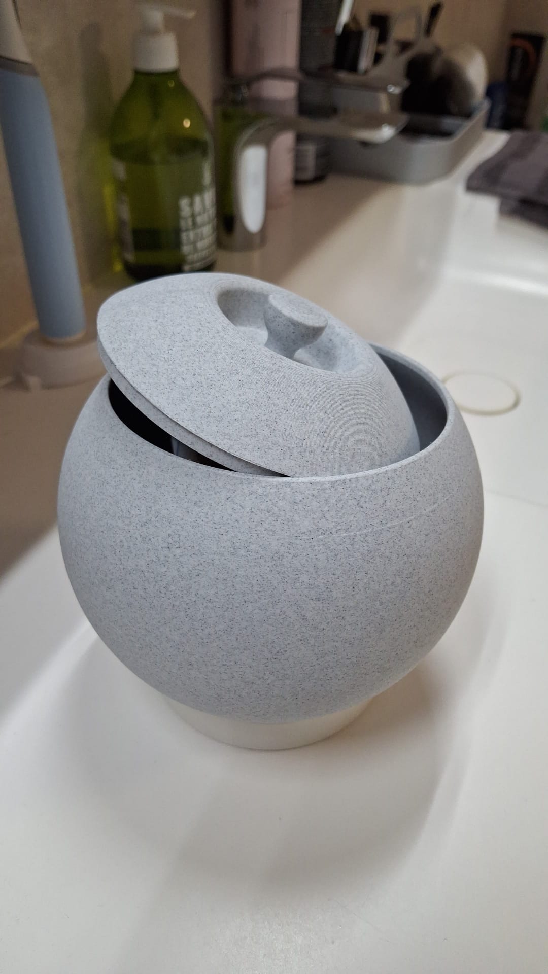 Mẫu Bathroom Waste bin có nắp, phần thân đặt tự do trên đế nên xoay được, không cần dán keo. File 3MF gồm đủ 3 part đã định hướng sẵn; in PLA, cần organic support và brim theo hướng dẫn.