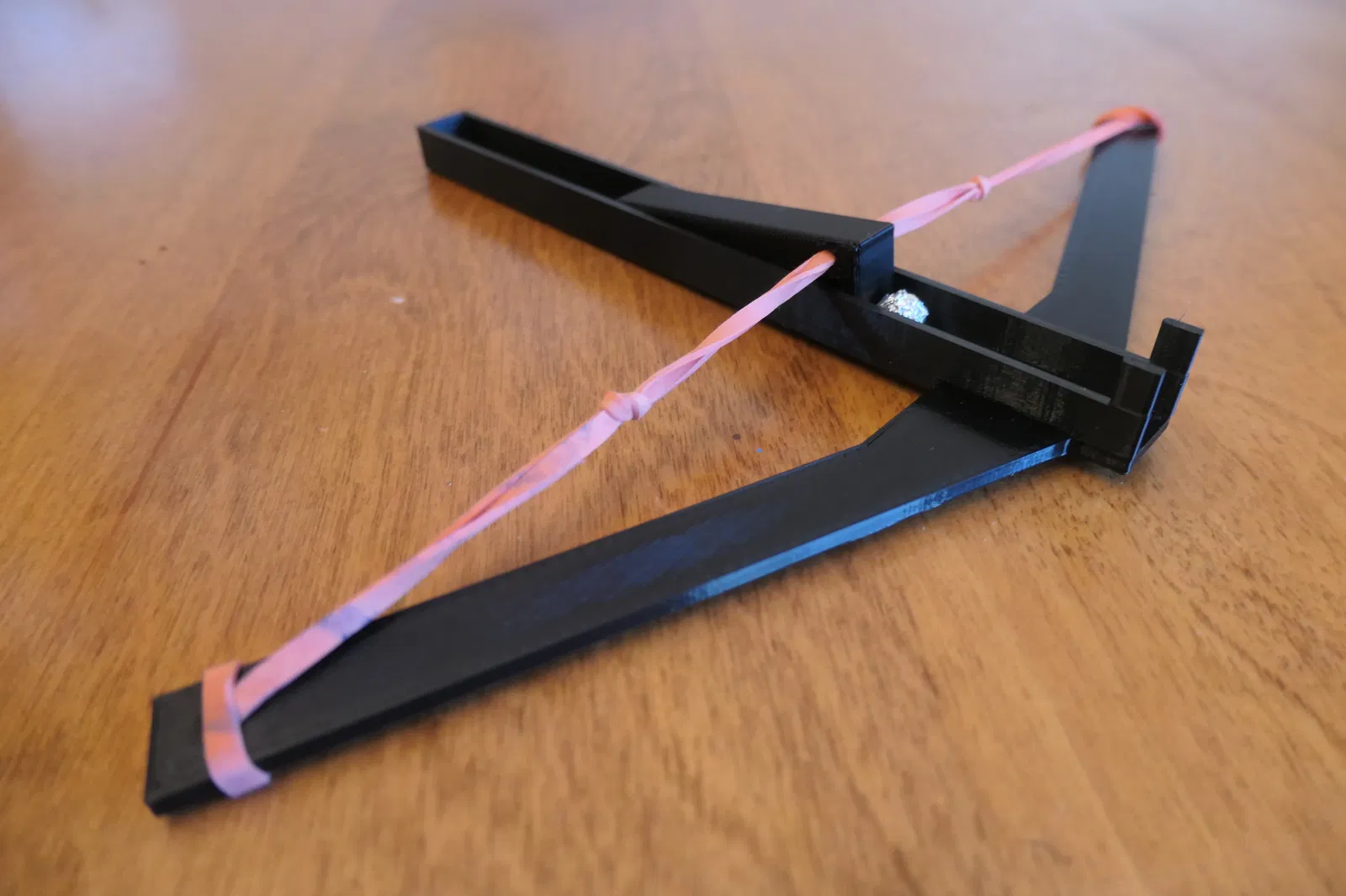 Năm ngoái, cây nỏ đồ chơi này được làm từ que kem. Năm nay có máy in mới nên tới lúc chuyển qua bản nhựa. Chỉ cần gắn thêm vài sợi rubber band, dây thun (elastics) hoặc ống latex tubing là hoàn thiện phần cánh nỏ. Lỗ trên hai nhánh cánh là 1/8" nên chọn ống cho đúng cỡ hoặc tăng kích thước lỗ lên.