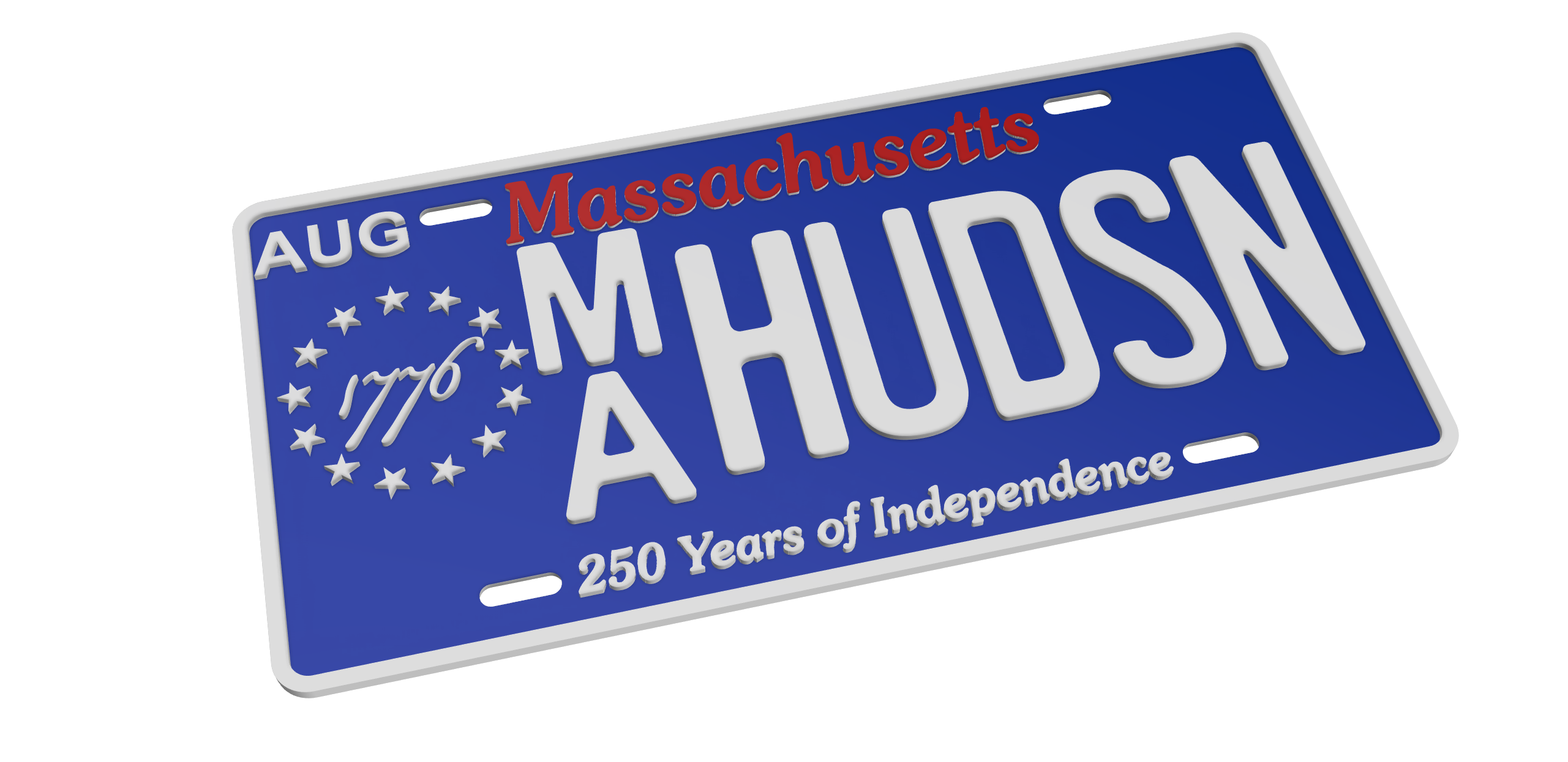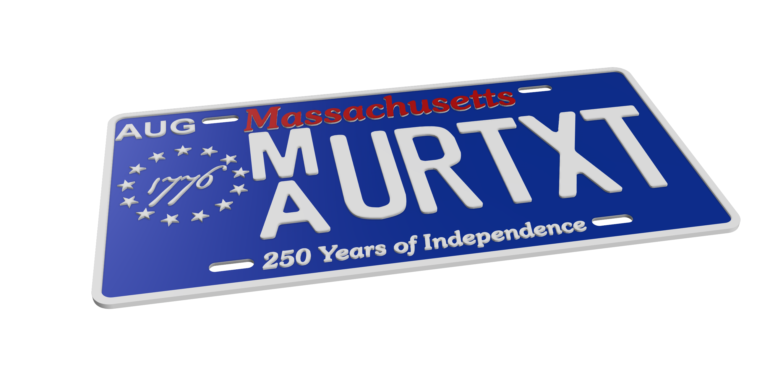 Biển số đặc biệt Massachusetts kỷ niệm 250 năm, có 5 ô chữ parametric tùy chỉnh.