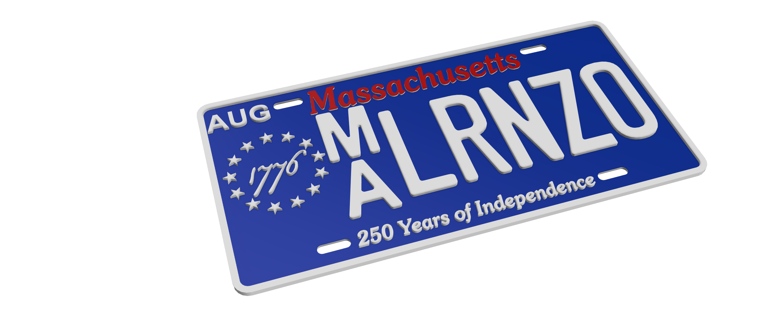 Mẫu biển số đặc biệt Massachusetts kỷ niệm 250 năm với 5 ô text parametric để tùy chỉnh. Vào MODIFY → Change Parameters và nhập mỗi ô 1 ký tự; có thể scale trong slicer, nên cài đúng font gốc.
