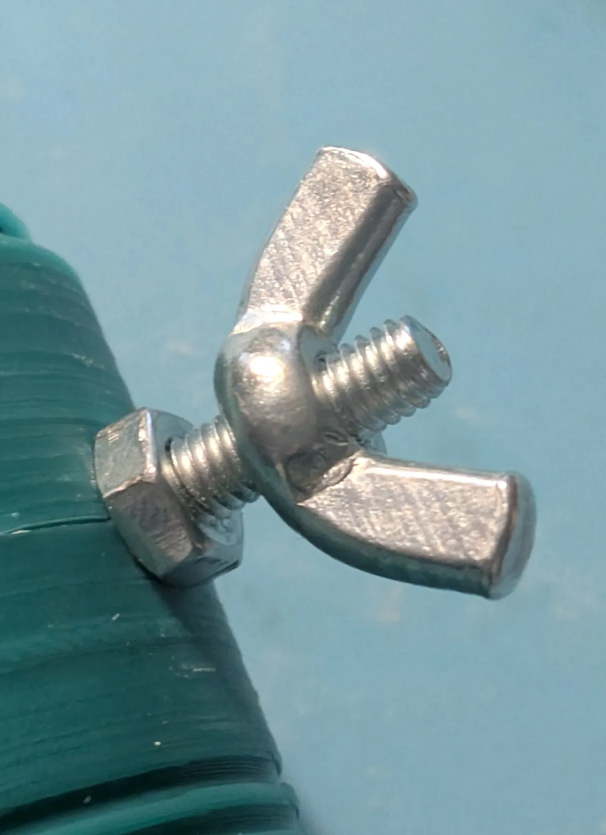 - Vặn một đai ốc M4 lên một con ốc M4x25. Sau đó gắn dây vào con ốc và siết lại. Đưa con ốc và dây vào lỗ TỪ BÊN TRONG hướng ra ngoài. Bắt thêm một đai ốc nữa từ phía ngoài đế. Dùng lỗ gắn BNC để đưa dụng cụ vào giữ đầu ốc trong lúc siết đai ốc này. Chừa đầu dây có vòng mass BNC thòng ra ở lỗ dưới của thân chính. KHÔNG SIẾT QUÁ CHẶT ĐAI ỐC – SẼ LÀM HƯ NHỰA.