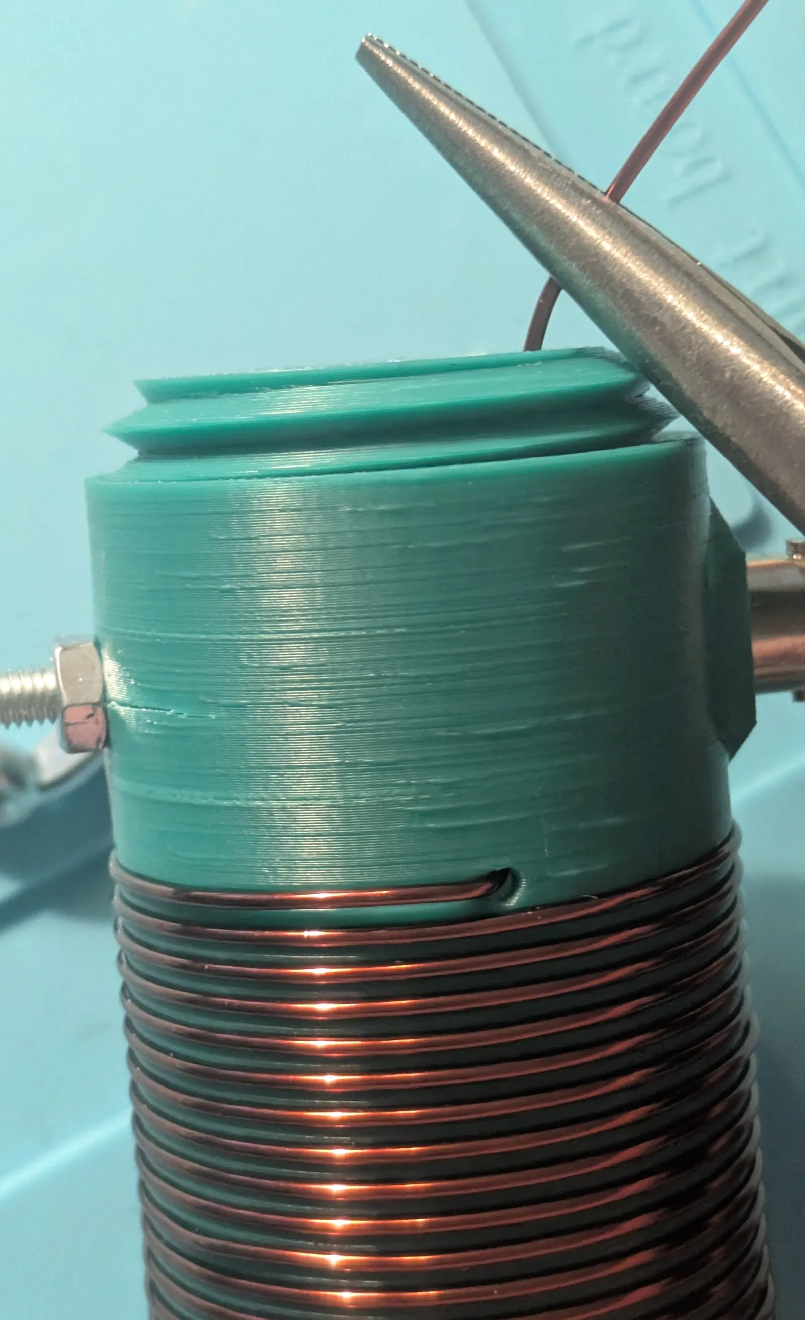 - Quấn 18 vòng dây quanh phần đế coil – KHÔNG ĐỂ DÂY BỊ CHÙNG. Luồn phần dây còn lại vào lỗ nhỏ ở đáy coil rồi cho ra phía dưới thân. Kéo căng. Gấp dây tì vào mặt trong của coil sẽ giữ đủ lực căng để coil không bị tuột.