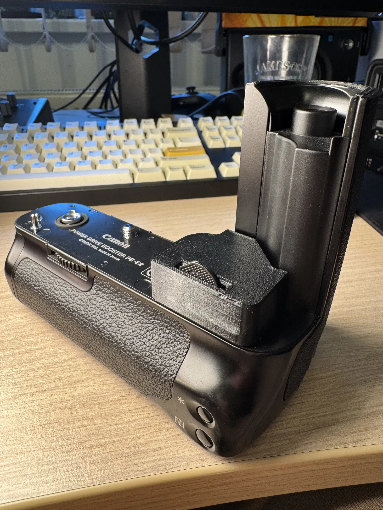 Mẫu nắp che contact thay thế cho Canon PB-E2 motor drive/battery pack, giúp tránh bị chập khi bỏ trong balo/túi. Khuyến nghị in TPU; nếu in PLA/PETG có thể cần scale ~101% để vừa khít.