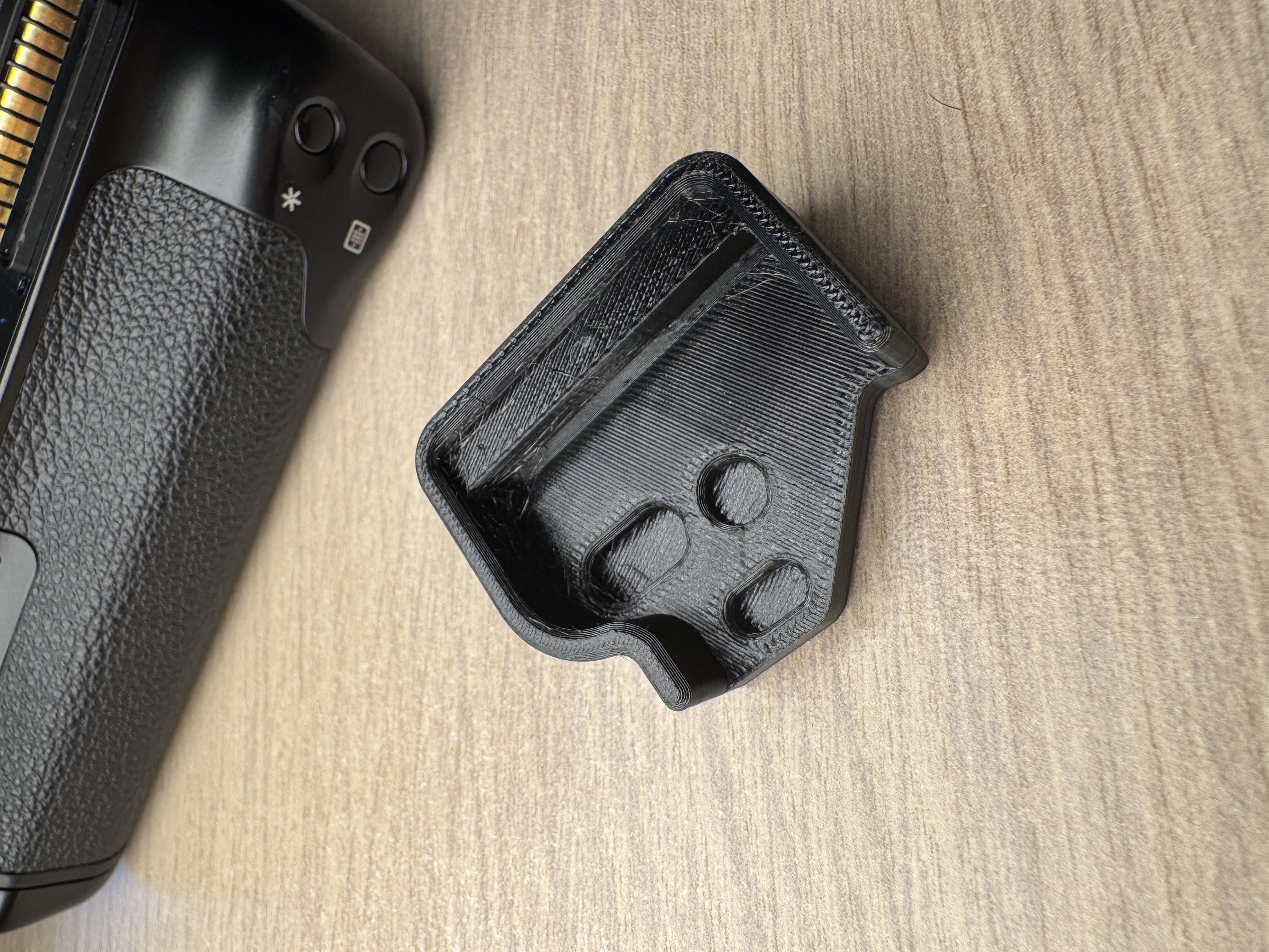 Cách dùng là: bạn tháo cái small grip khỏi máy (GR-E1 hoặc GR-E2), tháo motor coupler cap ở đáy máy rồi gắn nó vào nắp in 3D, đúng cái khe dành riêng. Sau đó nhấc cả cụm ra và gắn lên small grip.