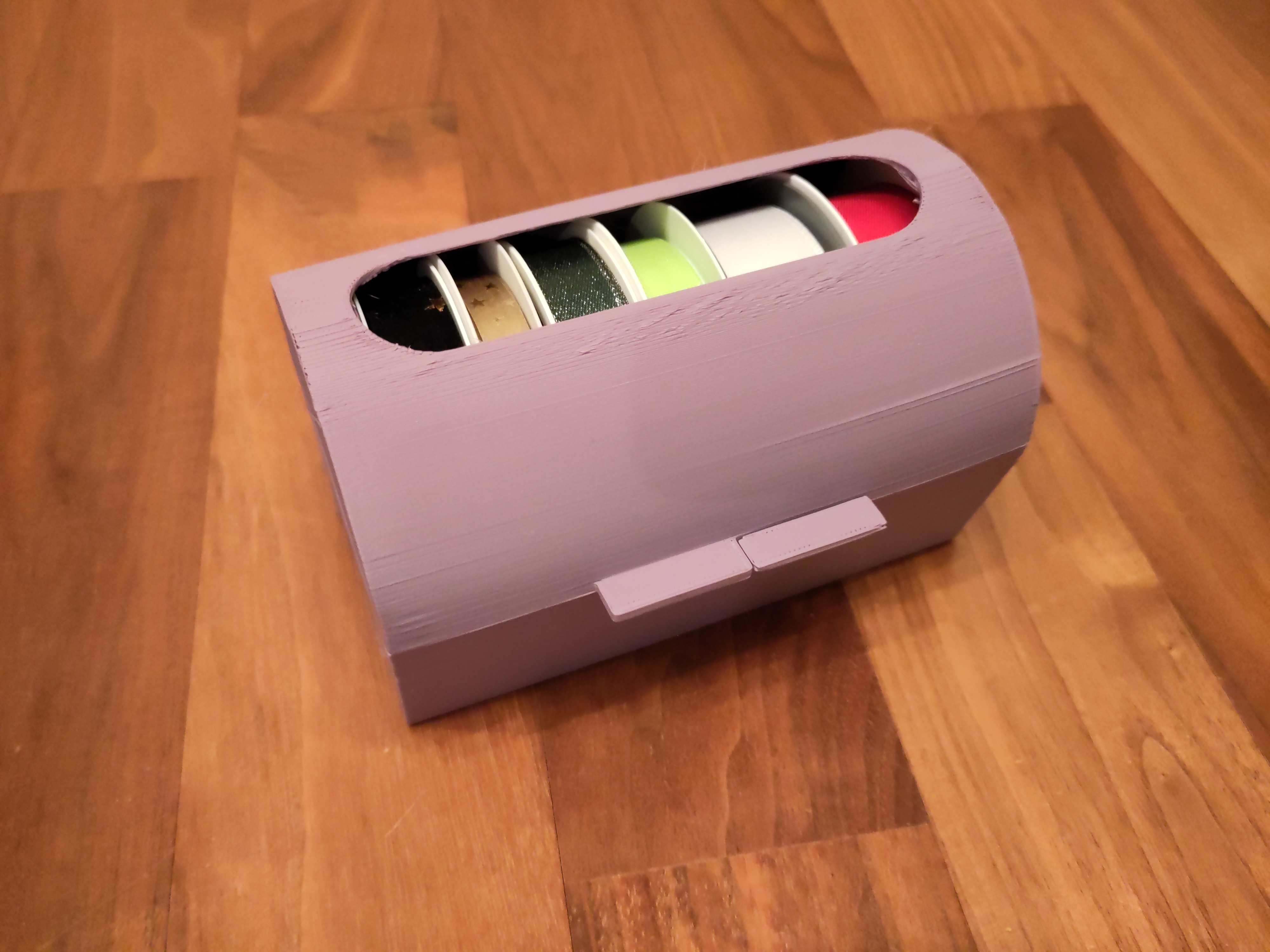 Hộp lưu trữ dành cho các cuộn ruy băng quà tặng đường kính tối đa 87 mm. Phần trục và đầu trục tham khảo thiết kế của 9percent; phần hộp do mình tự thiết kế. In 2 đầu trục.