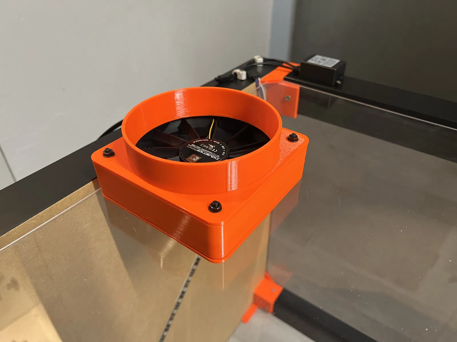 Vỏ quạt 120mm dùng cho buồng build máy in 3D hoặc máy sấy, có cổng nối ống xả 125mm. Cần quạt 120mm, ốc M4x45, ê-cu M4, long đền và bộ nguồn. Chiều dài ốc tùy độ dày kính.