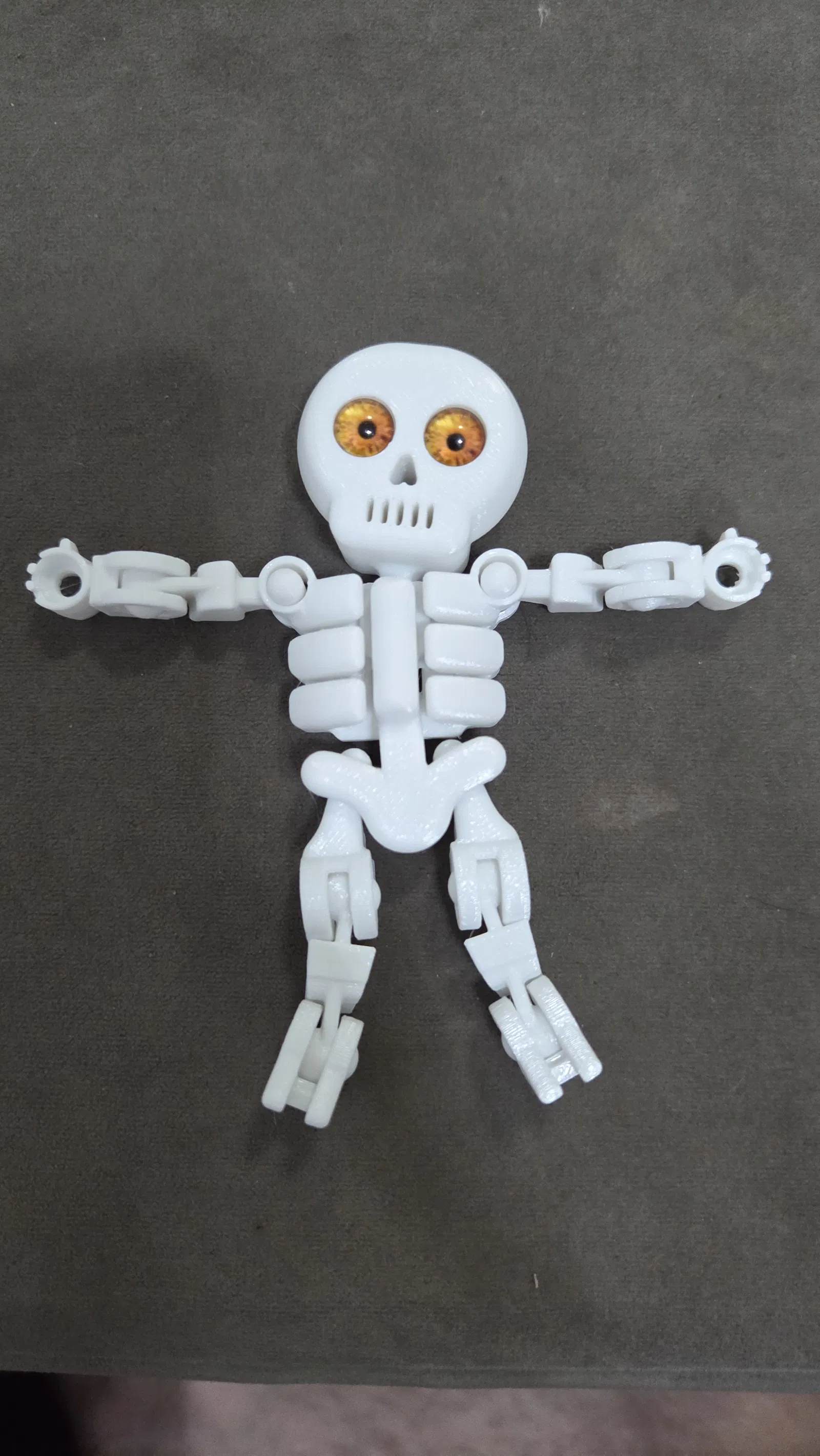 Remix từ Articulated Skeleton Toy của t3dworld để gắn vừa mắt thủy tinh 8mm. Dựa trên bản v2 với khớp gối chắc hơn và in như bản gốc, không cần supports.