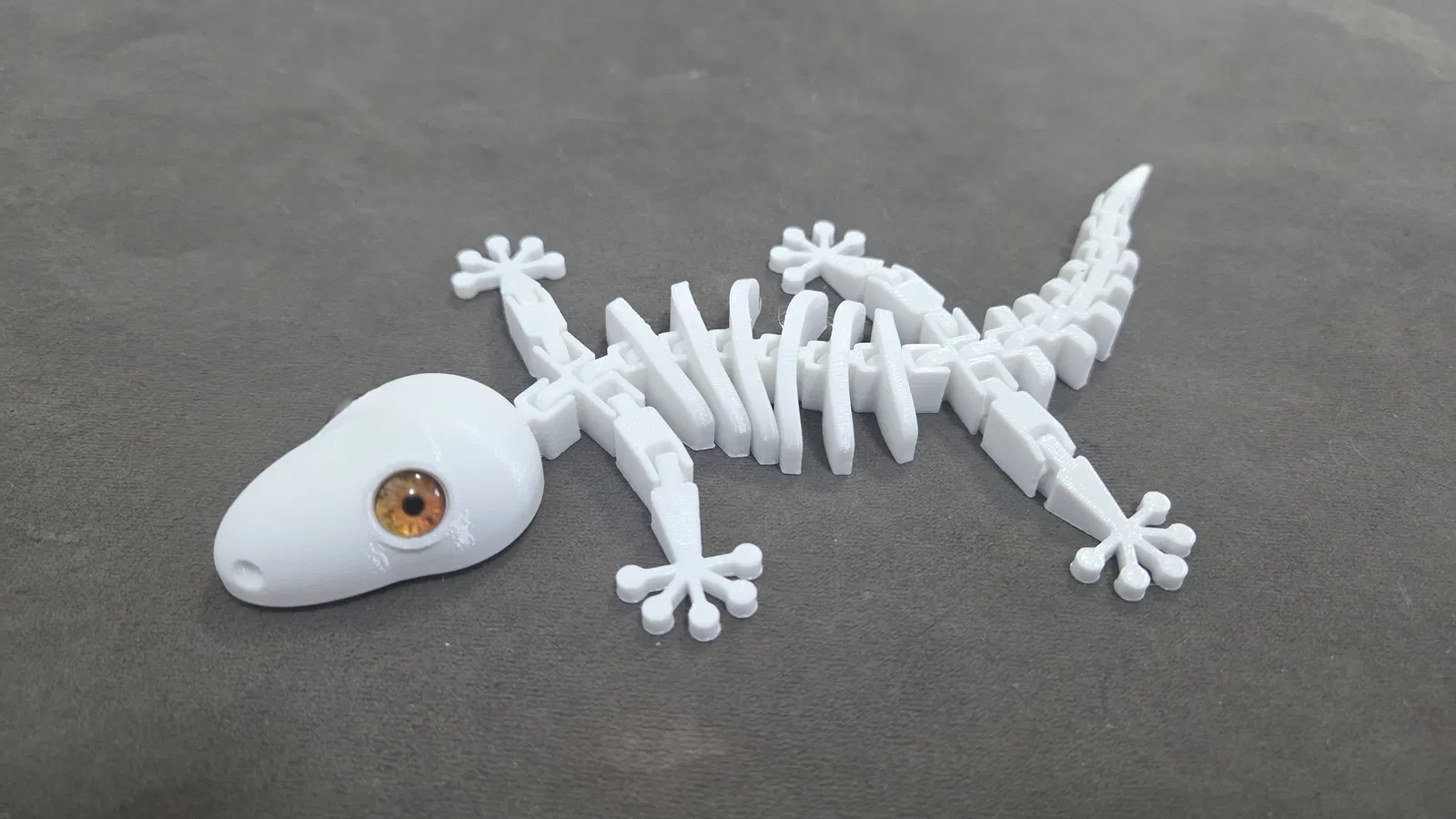 Mẫu Flexi gecko skeleton đã được remix để lắp vừa mắt kính 8mm, giúp bản in nhìn nổi bật hơn. In không cần supports như model gốc. Có kèm link mua glass eyes và thông tin máy in Elegoo Centauri Carbon.
