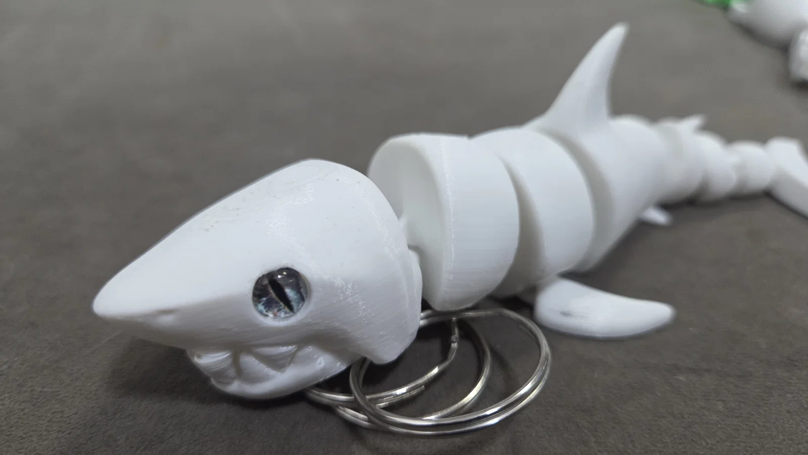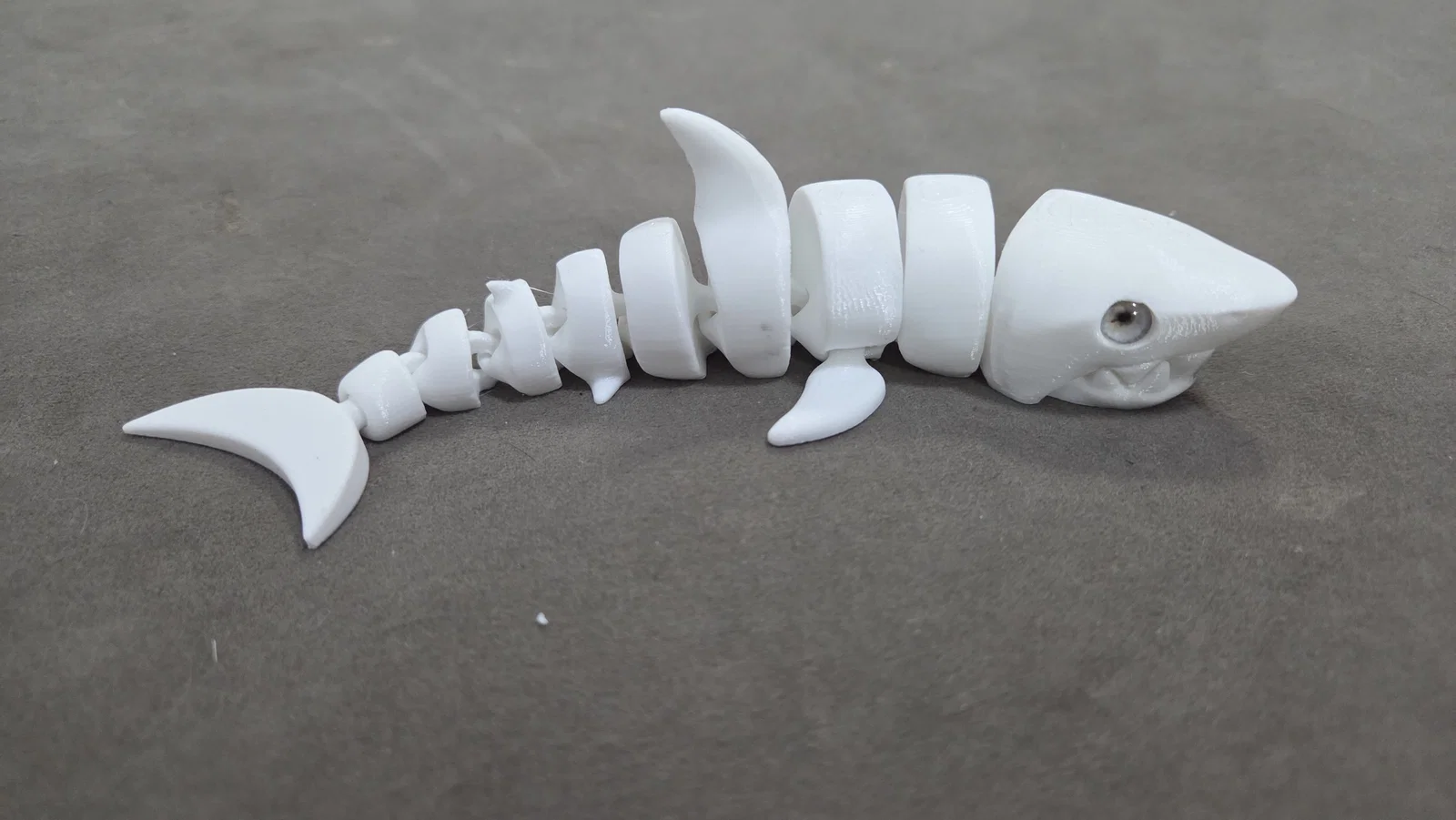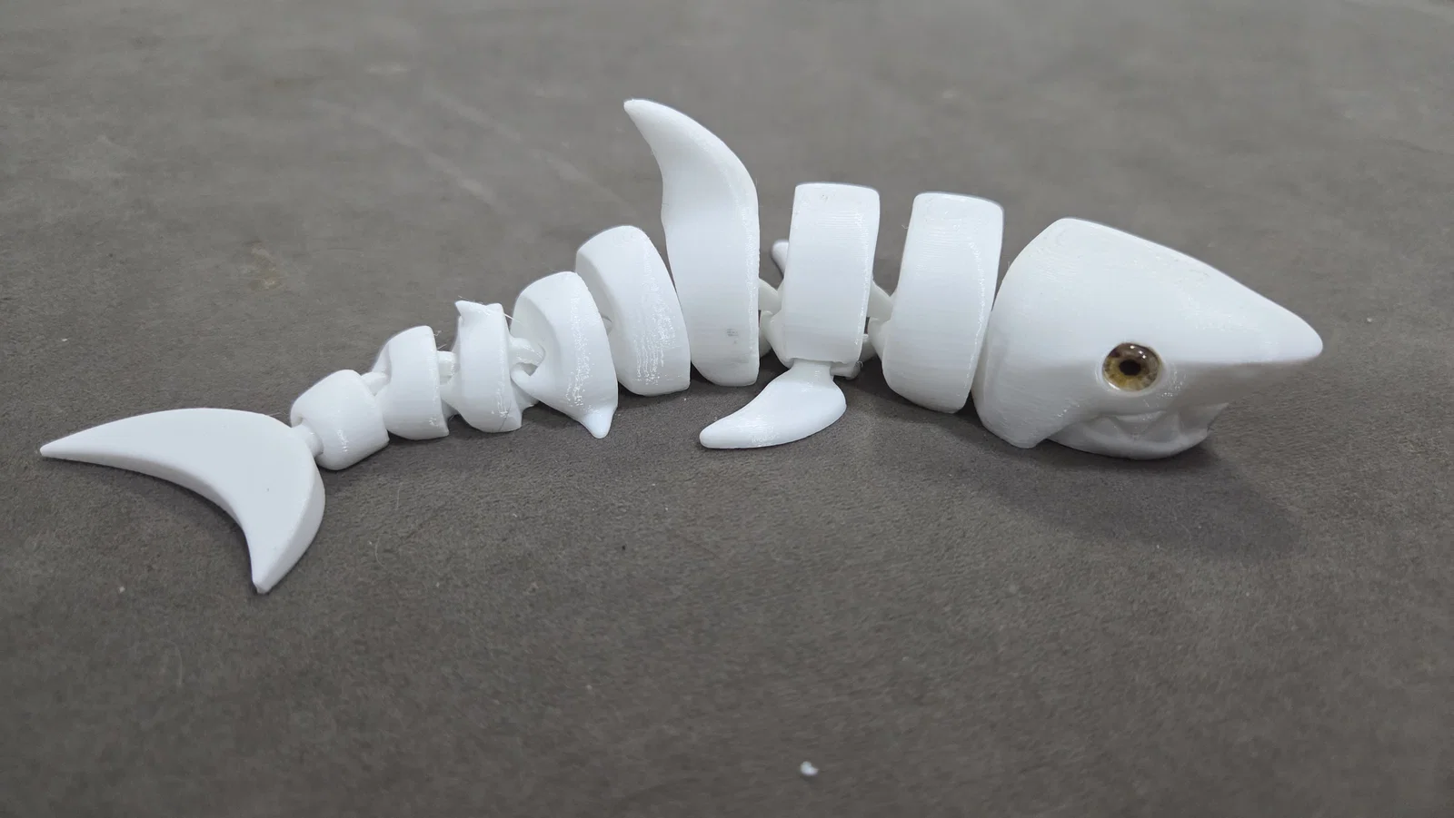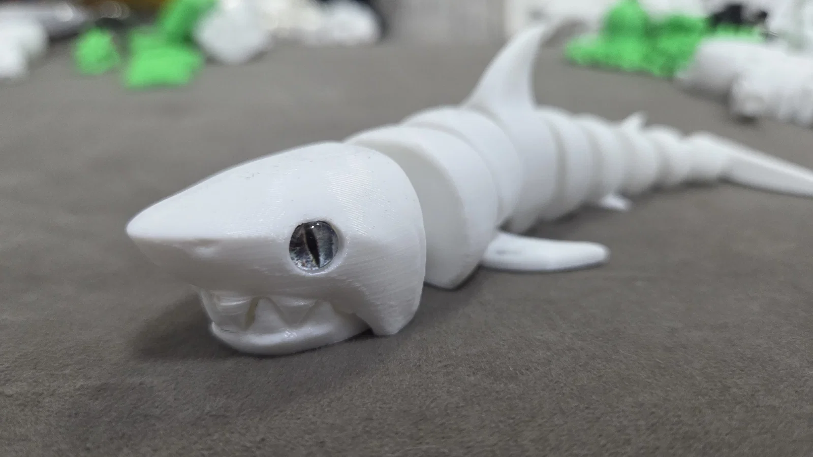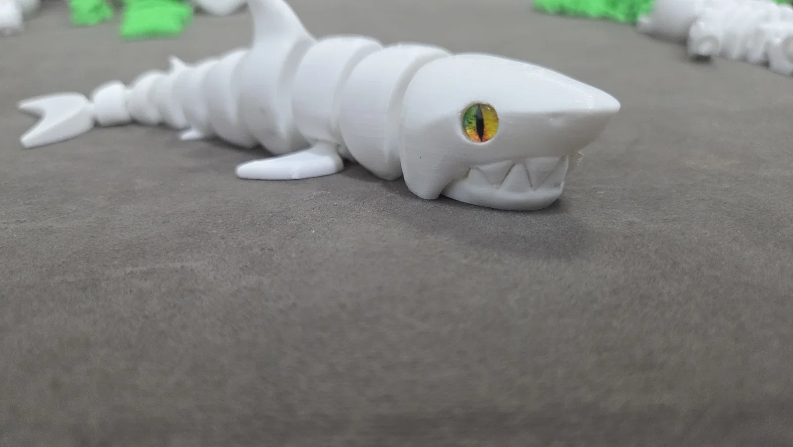 Bản remix cá mập articulated của McGybeer, chỉnh bằng negative modifiers để tạo lỗ gắn mắt kính 6mm. Có file 3mf, mở lên slice là thấy lỗ mắt. Giữ nguyên kiểu in như bản gốc, không cần supports.