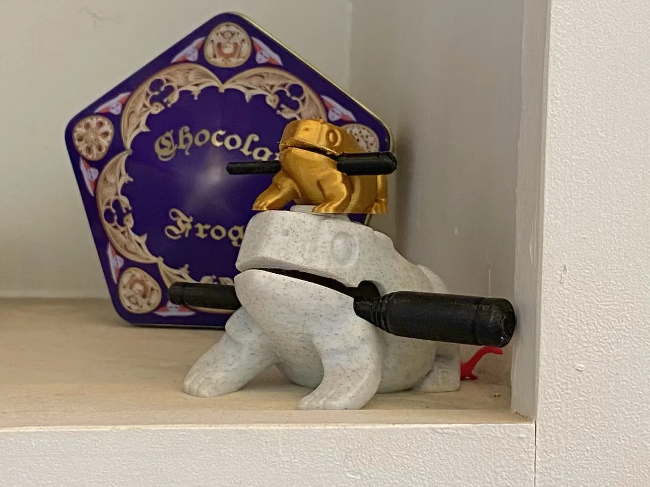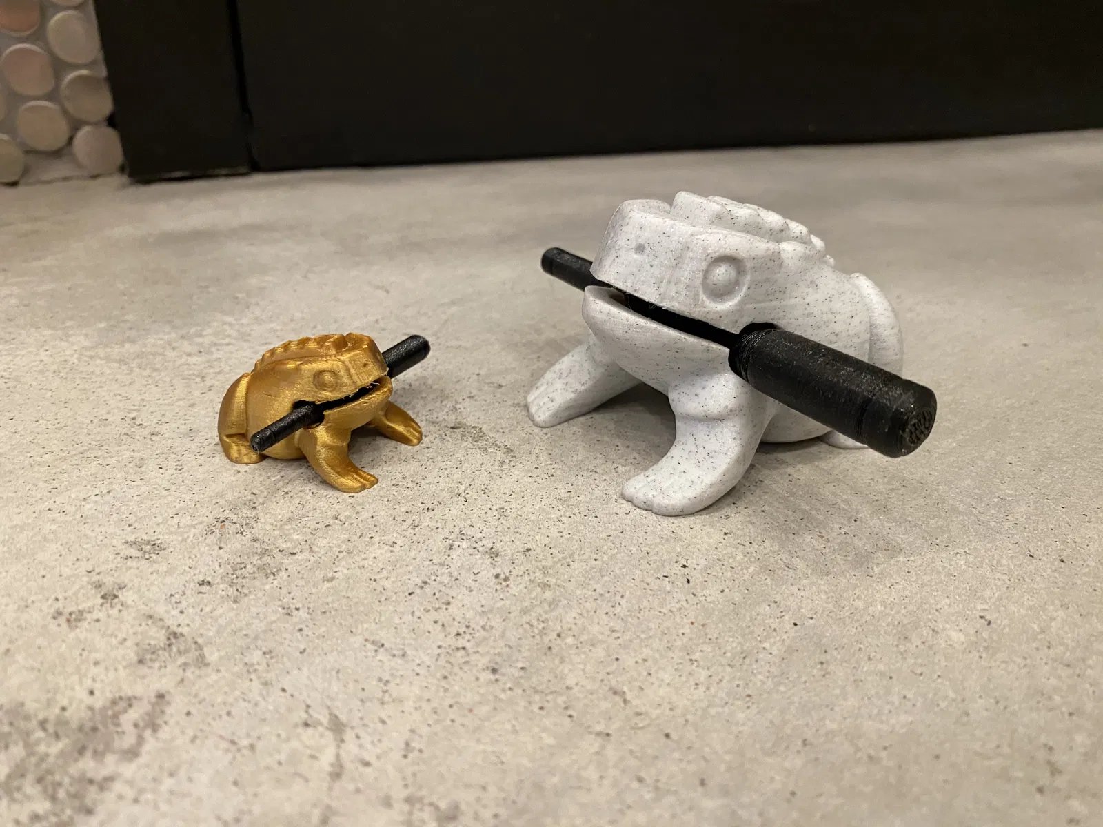 Mẫu percussion frog (guiro) dựa theo con ếch gỗ của ông ngoại. Chỉ cần support ở phần miệng; tránh support trong khoang bằng cách block trong slicer như Cura. Infill cao (mình dùng 90%) để tiếng kêu hay; đổi kích thước sẽ đổi pitch.