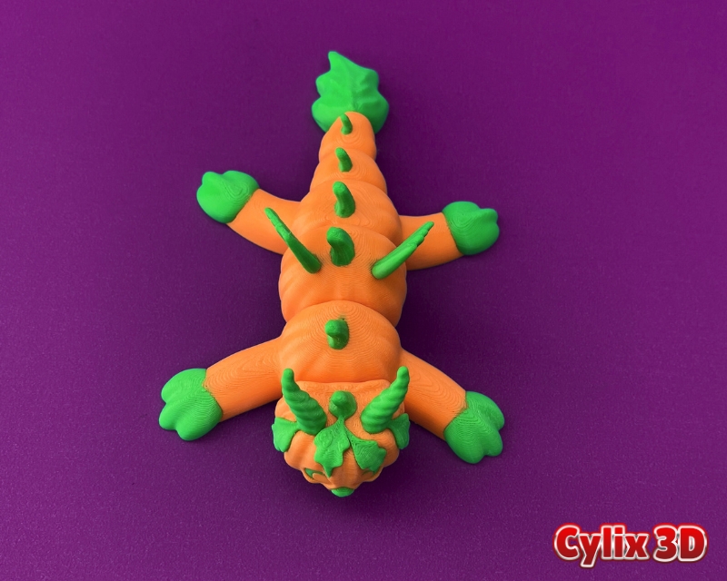 Flexi Pumpkin Dragon dạng articulated, in print-in-place và không cần support. Phù hợp làm đồ chơi hoặc quà Halloween. Lưu ý không scale nhỏ; để bed nguội rồi gỡ mẫu nhẹ tay để tránh gãy khớp.