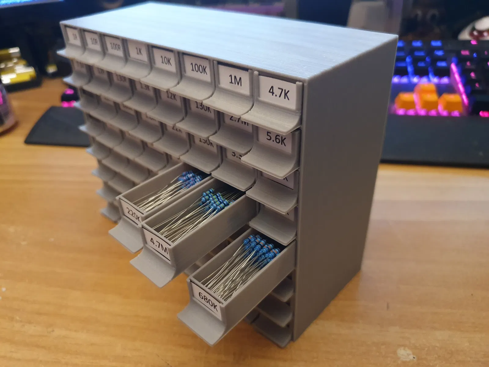 Hộp điện trở đơn giản Tôi đã thực hiện một thời gian trước, nó thực sự tiện dụng và dễ in, có các khe trong mỗi ngăn kéo để bạn có thể