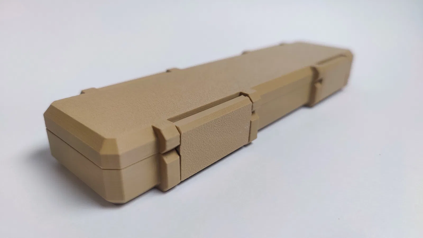 Hộp bút print-in-place có 2 chốt gài, in xong là dùng ngay, không cần lắp ráp. Kích thước lòng trong 190×40×19.8mm. Không cần supports, chỉ có chút bridging; bản lề file đã chỉnh còn 27mm.