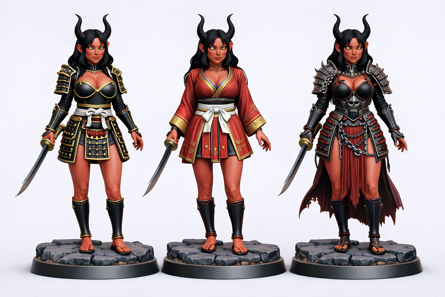 Pack 3 nữ oni kunoichi da đỏ, sừng đen và giáp samurai khác nhau. Chi tiết cao, mỗi figure file riêng kèm bundle, tối ưu in 3D (STL), hợp D&D/Pathfinder/tabletop và sưu tầm NSFW-friendly.