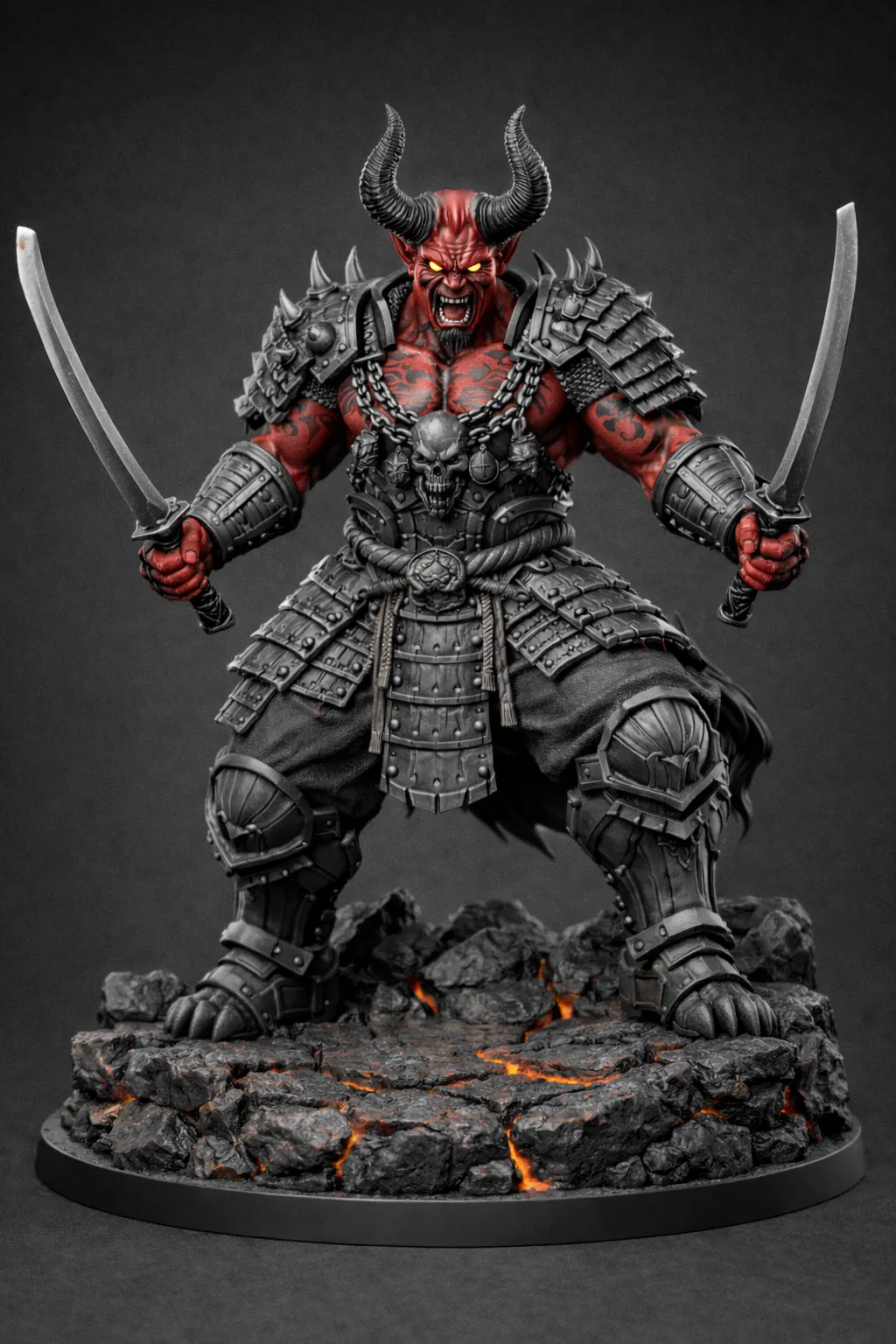 Mẫu oni berserker khổng lồ da đỏ, sừng lớn, giáp nặng kèm xích và sọ, cầm 2 katana trong tư thế tấn công. Chi tiết cao, base núi lửa nứt lava; tối ưu in resin, hợp làm boss D&D/Pathfinder.