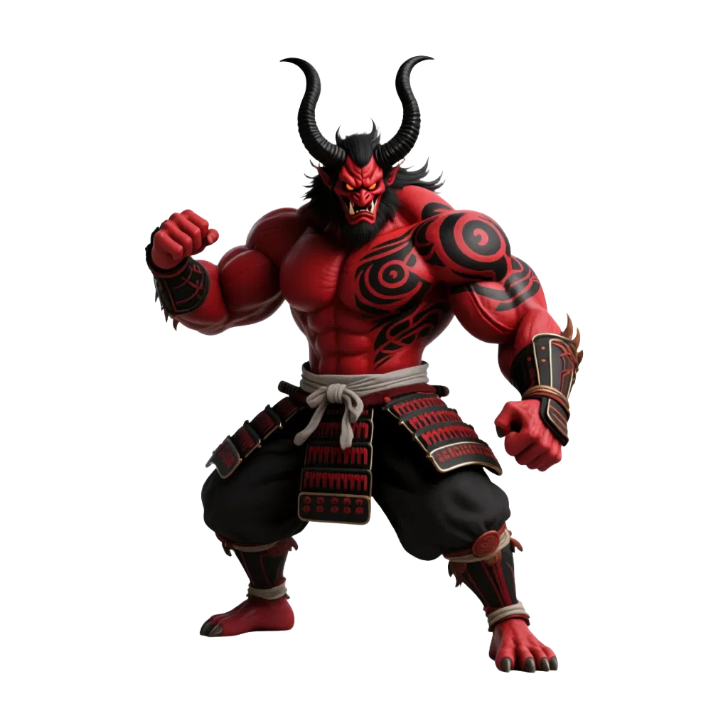 Thiết kế 100% original: oni quỷ đỏ với làn da đỏ scarlet rực, tattoo bộ lạc màu đen dạng xoáy, cặp sừng lớn cong vút, mái tóc đen hoang dại, râu và đôi mắt vàng sáng. Gương mặt bùng nổ giận dữ, thân hình siêu cơ bắp, nét cơ rõ. Giáp samurai dạng một phần tông đỏ/đen với các tấm giáp ở vai, tay và chân, thắt lưng thắt nút trắng và katana đeo ngang hông. Tư thế chiến đấu cực gắt với nắm đấm siết chặt, chân dang rộng, sẵn sàng lao thẳng vào kẻ địch.