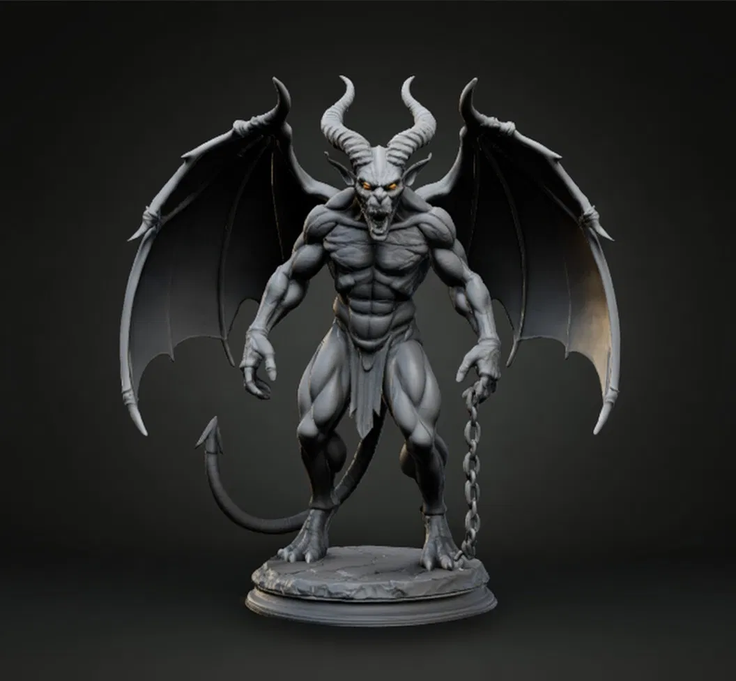 Tượng quỷ địa ngục bị xiềng xích với cánh màng to, sừng cong vặn và ánh mắt dữ tợn. Dáng đứng uy lực, chi tiết dày, hợp in 3D để trưng kệ, decor gothic hoặc dùng cho tabletop như D&D/Pathfinder.