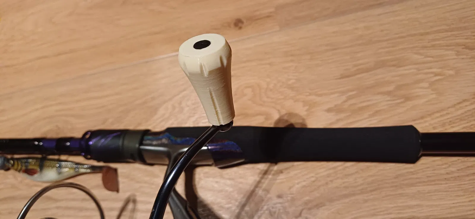 Núm tay quay cho máy câu Daiwa. Nếu lúc lắp bị kẹt hoặc khó xỏ, nên doa/làm sạch các lỗ bằng mũi khoan 7mm và 4,5mm để vòng bi (bearings) vừa khít và chạy êm.