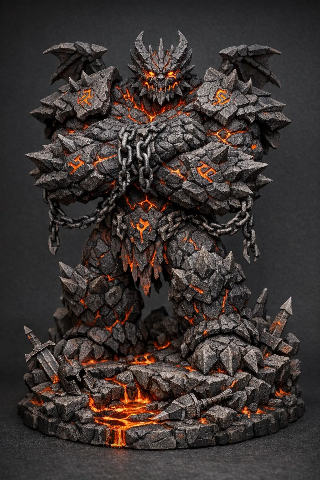 Thiết kế 100% nguyên bản: một con golem khổng lồ làm từ đá núi lửa tối màu, khắp thân đầy những khe nứt phát sáng với dòng lava đỏ rực chảy xuyên suốt; rune địa ngục khắc/đính ở ngực và tay; nắm đấm to, giáp vai nhọn; xích gãy lòng thòng ở cổ tay; đôi cánh đá nhỏ sau lưng; đuôi đá cong ôm quanh phần đế. Tư thế canh giữ với hai tay khoanh trước ngực và ánh nhìn dữ tợn. Đây là mẫu cao và “bự” nhất trong bộ sưu tập (~250 mm) – hộ vệ hoàn hảo cho demon, succubus và pháp sư.