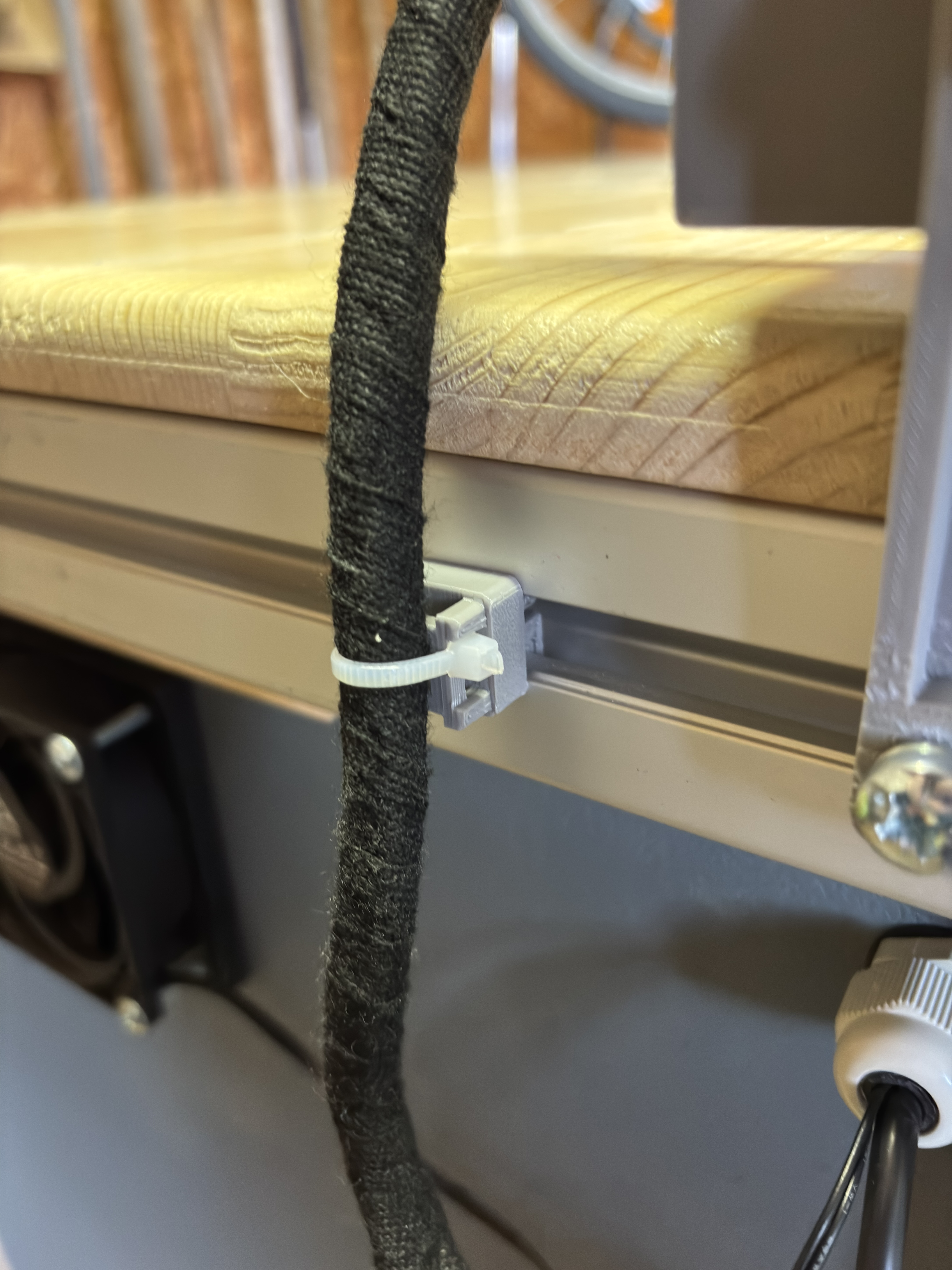 Kẹp dây cáp cho nhôm định hình 4545, lấy cảm hứng từ BOSCH Rexroth. Kẹp vặn vào rãnh trong (20 mm) của profile để bám chắc. Khuyến nghị in HyperPLA và in trên cạnh để tăng độ bền.