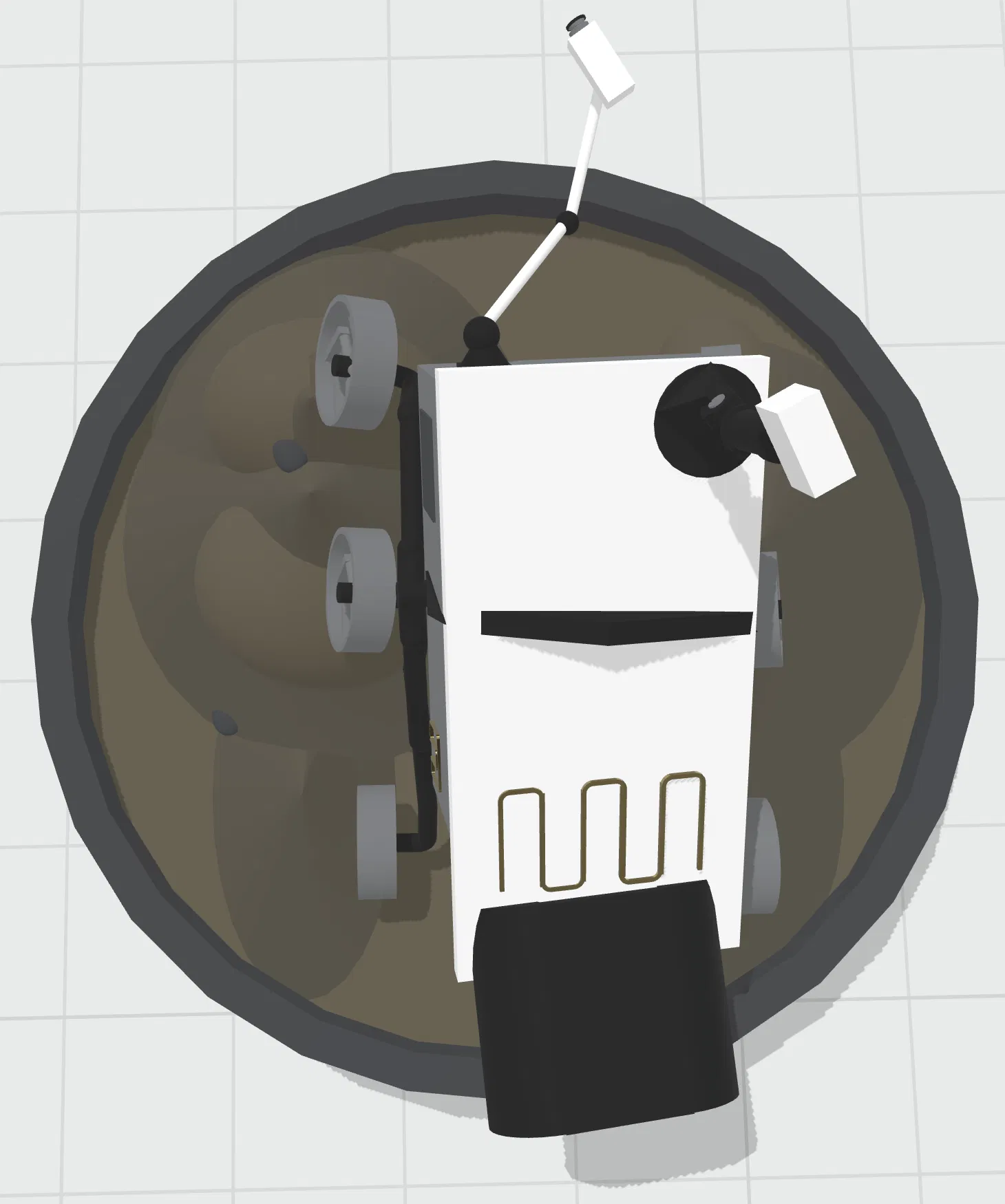 Một mẫu Mars Rover mình làm, đang “khám phá” một khu vực trên sao Hỏa. Nó có hai camera: một cái ở trên đỉnh và một cái ở đầu một cánh tay dài; phía sau có bộ phát điện hạt nhân để cấp nguồn. Mẫu này dựa theo phiên bản thật ngoài đời. Làm bằng Moblo 3D.