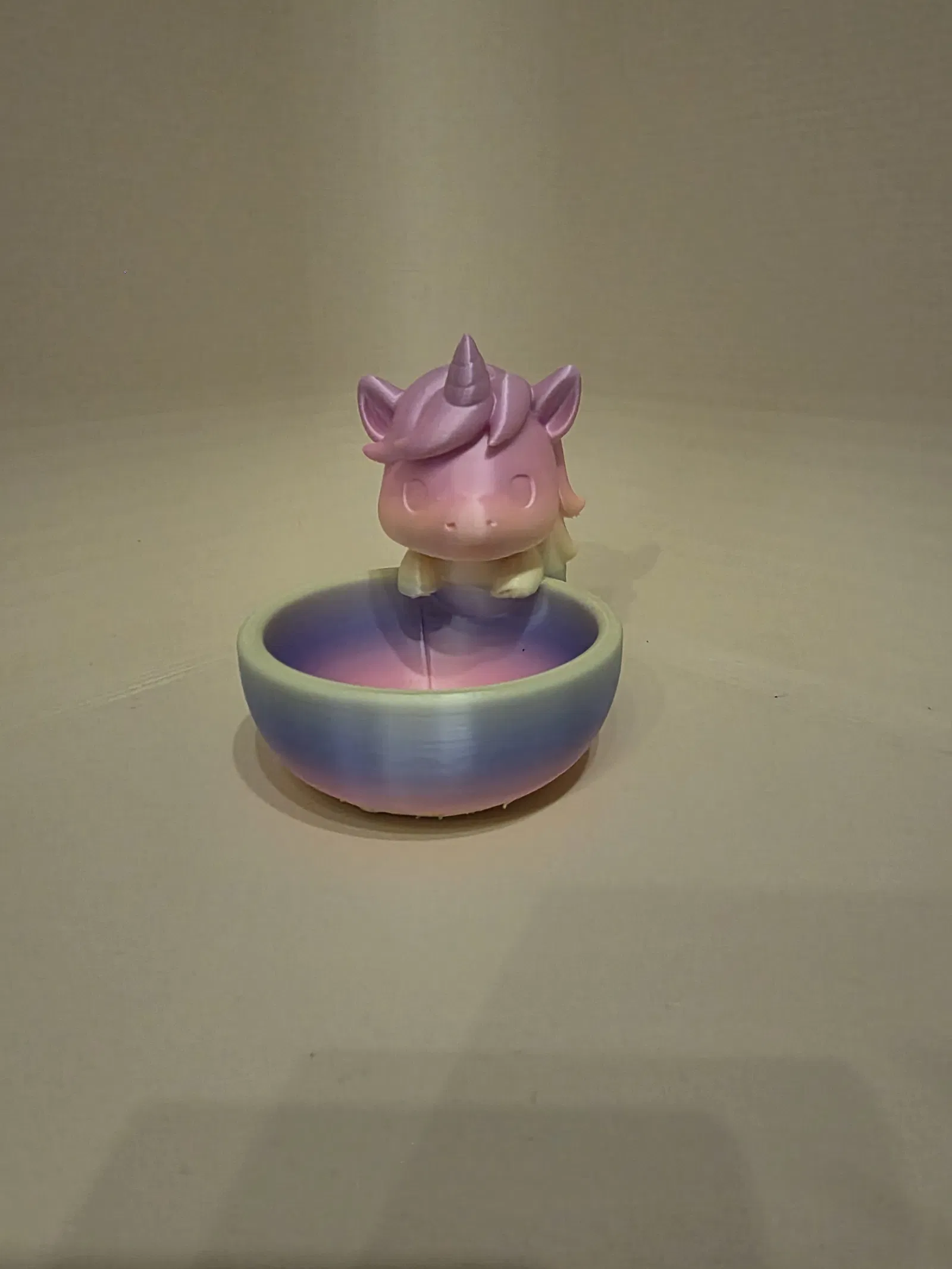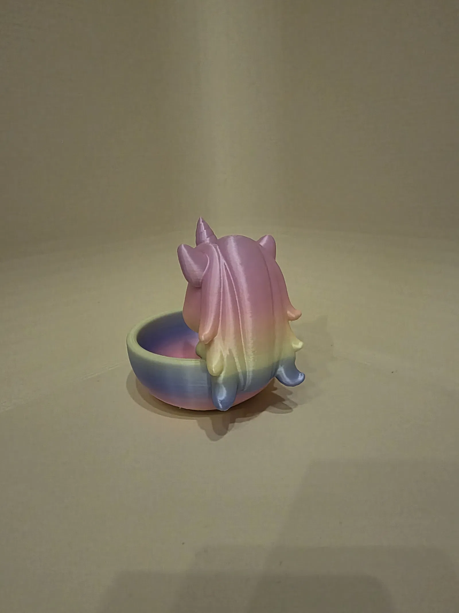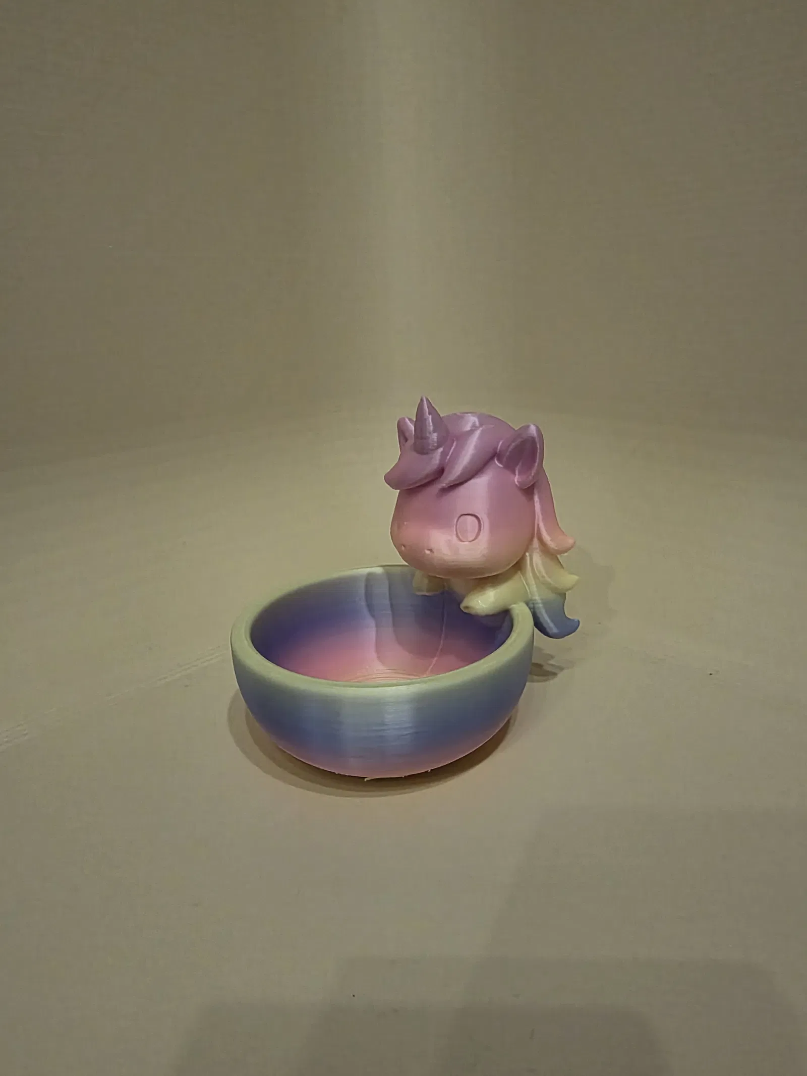 Chén/khay trang trí phép thuật với chú kỳ lân đang ngủ yên, tông pastel dịu và form bo tròn mềm mại. Chỉ để decor: đựng đồ nhỏ, trưng bày vật lặt vặt, làm kệ phòng bé thêm chất fantasy.