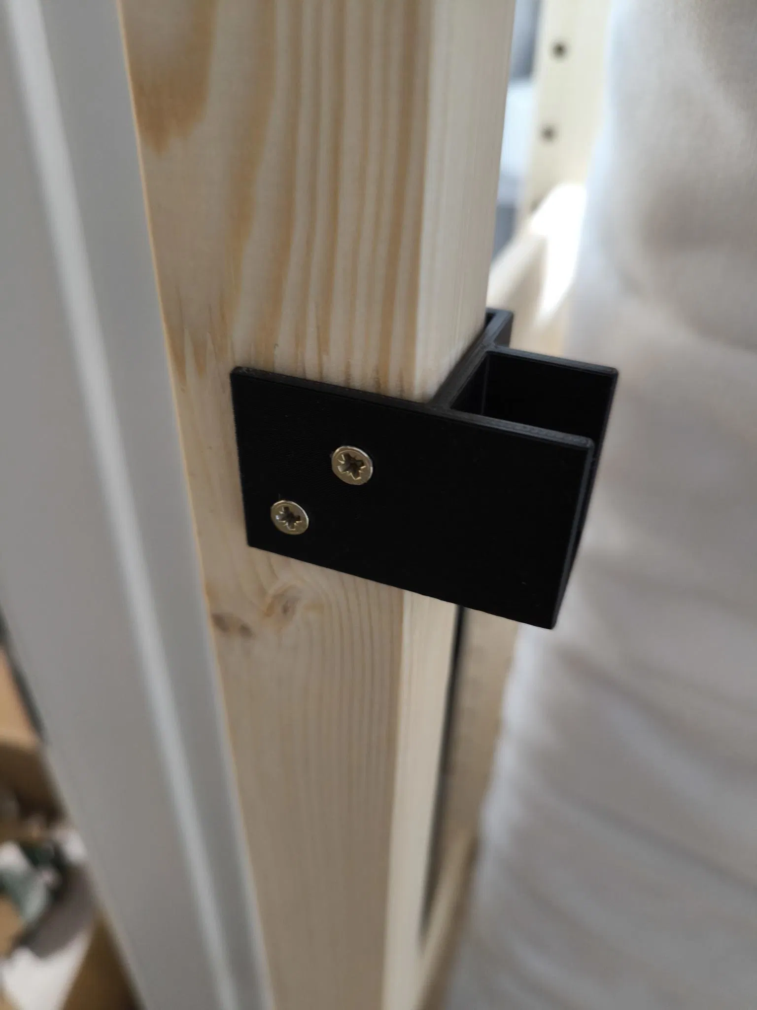 Một cái giá đỡ có thể bắt vít cố định lên khung IKEA Ivar. Khi đặt một thanh gỗ vào, nó sẽ chặn không cho đồ vật bị rơi ra ngoài.