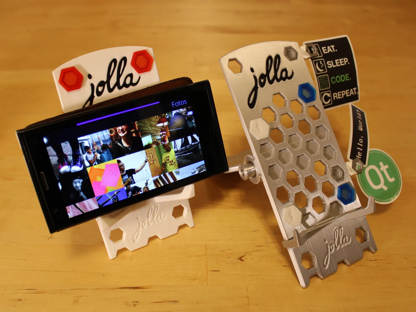 Giá đỡ trưng bày điện thoại Jolla/SailfishOS in 3D cho FOSDEM 2026, thiết kế print-in-place, chỉnh 6 góc với góc thấp 17°. Có bản Small và Large (honeycomb gắn phụ kiện), đi dây USB gọn và dùng được khi dock.