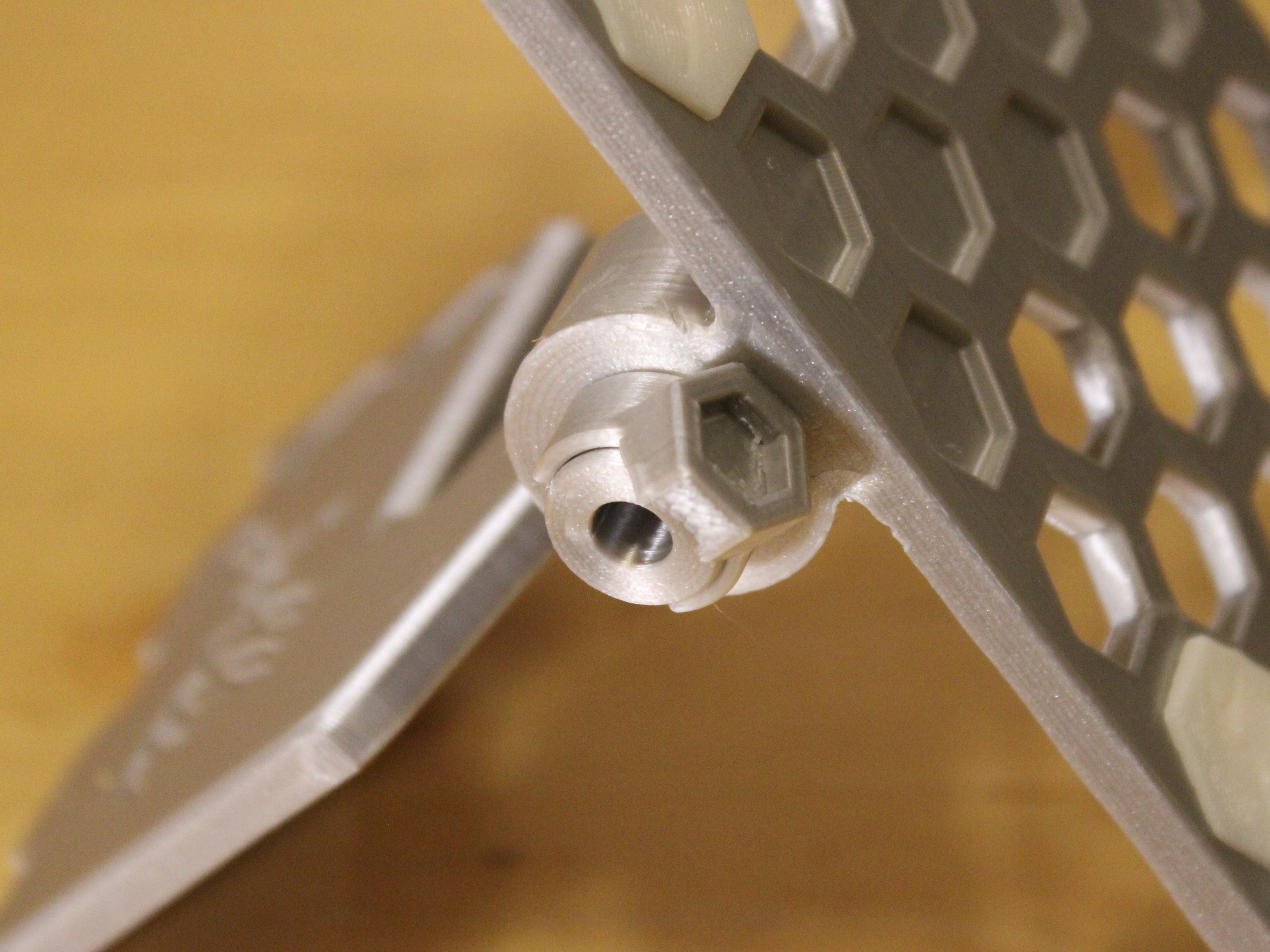 Thiết kế này là bản remix từ mẫu Adjustable phone/tablet holder cực hay của E. Soderberg , được chọn vì cơ chế chỉnh góc rất chắc và tiện kiểu print-in-place. Mình đã tinh chỉnh để phù hợp dùng trong hội chợ: tối ưu góc thấp 17° để dễ nhìn trên bàn thấp khi khách đứng xem, đồng thời thêm hoạ tiết honeycomb để gắn phụ kiện dạng modular như tờ thông số (spec sheet) hoặc khay/kẹp sticker.