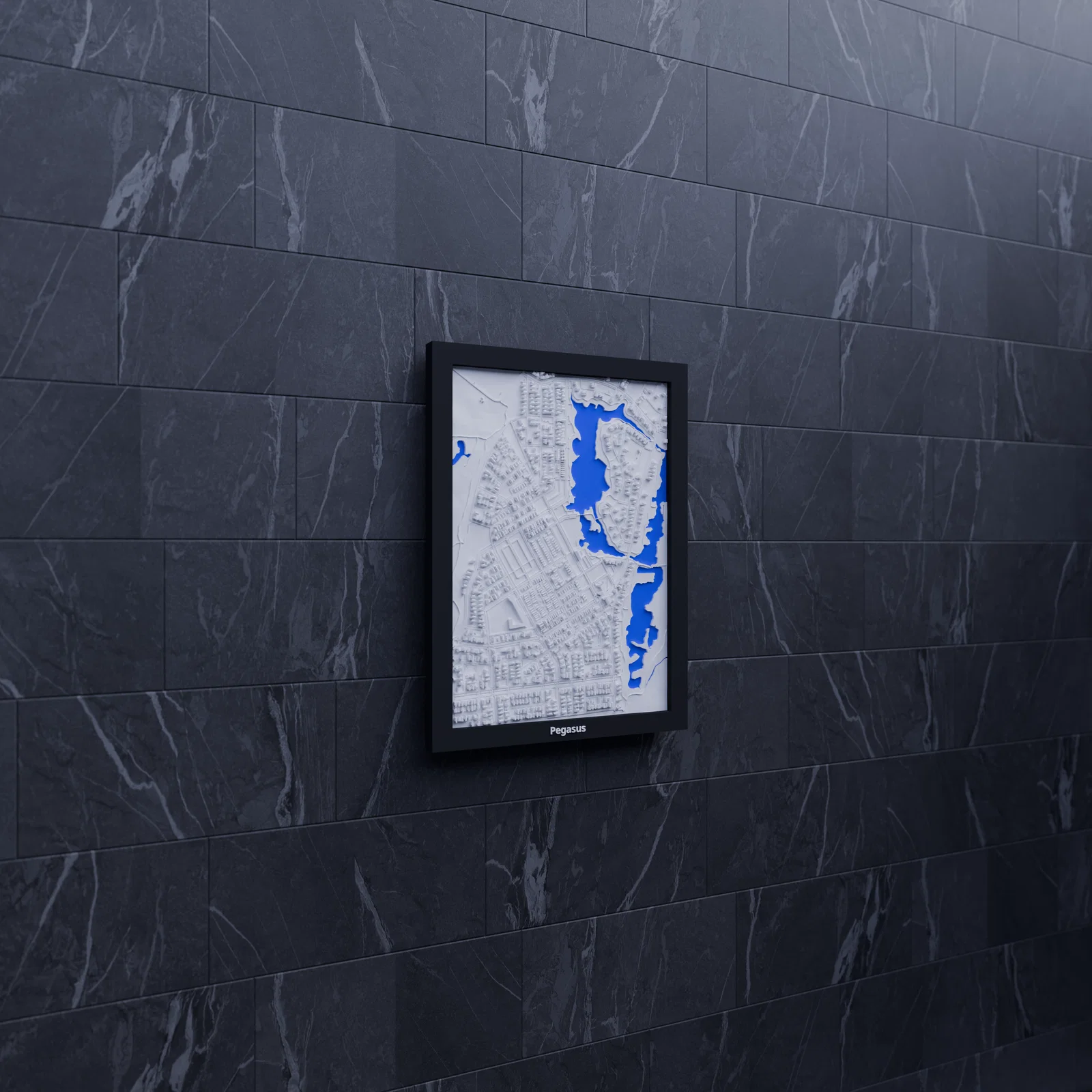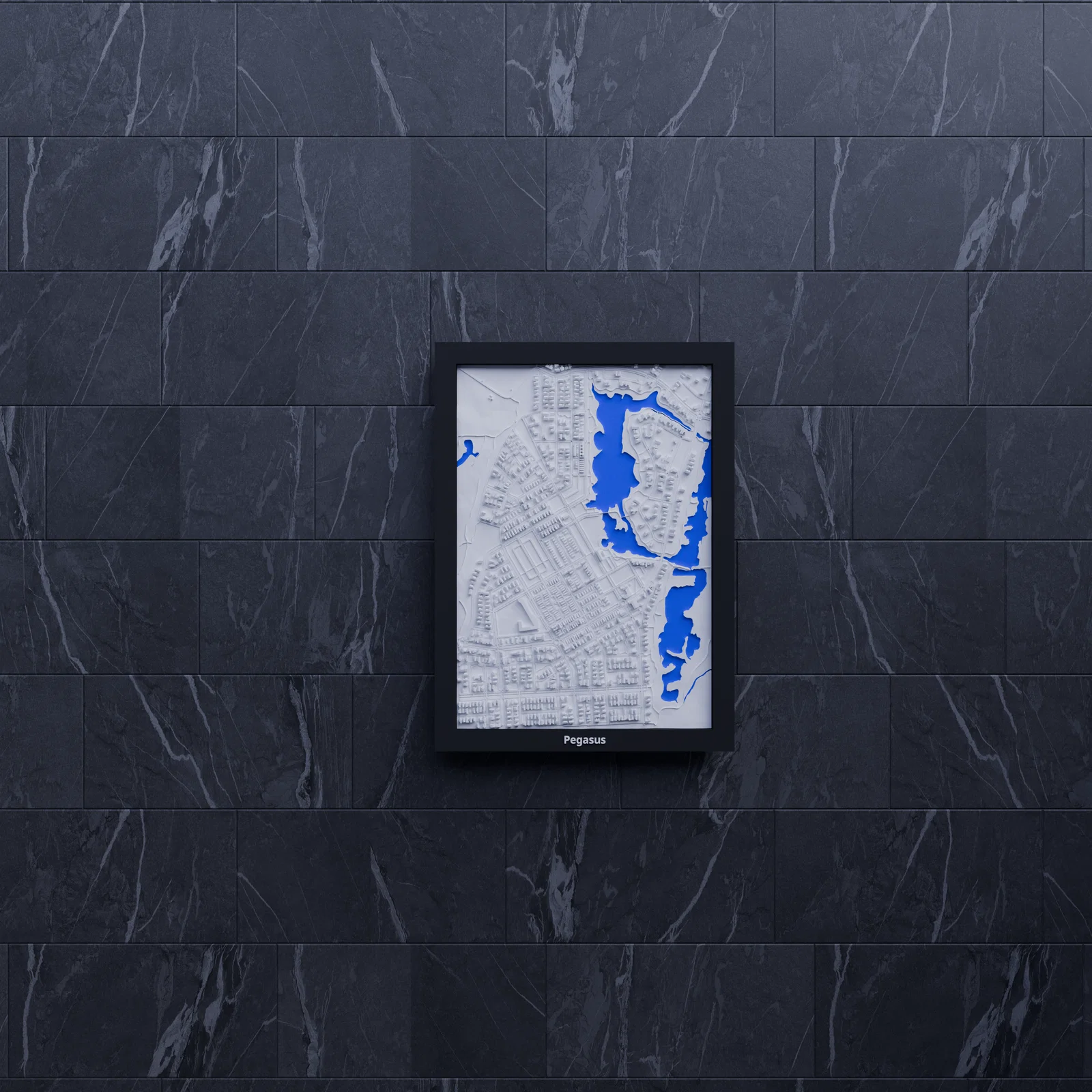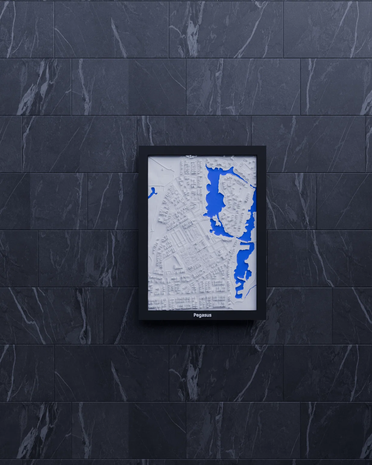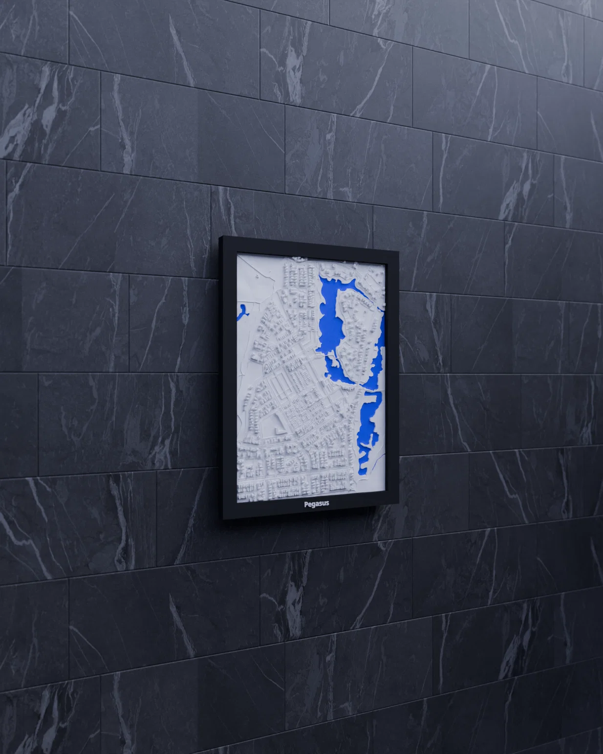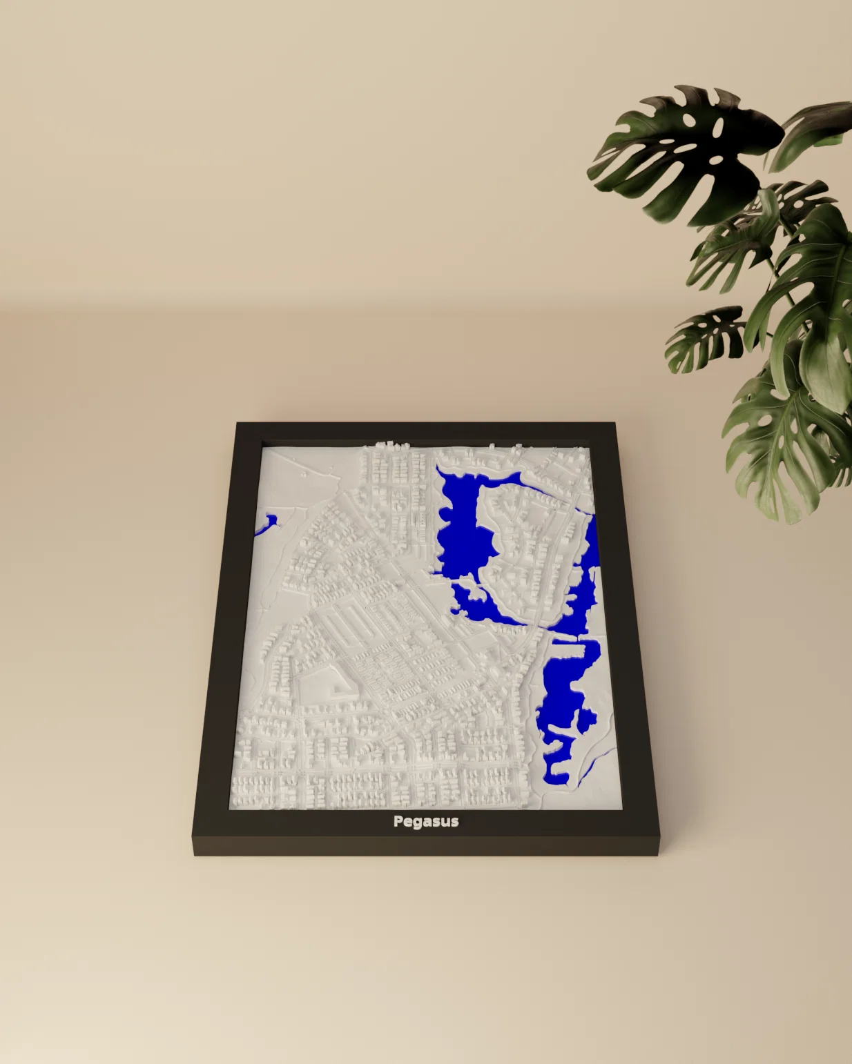 Miniature địa hình in 3D tái hiện cảnh quan Pegasus (New Zealand) dựa trên dữ liệu địa lý thật, thu nhỏ từ khu vực 1.197 km x 1.702 km xuống 119.5 x 170.5 mm. Có nhiều frame kèm lỗ treo và print profile.