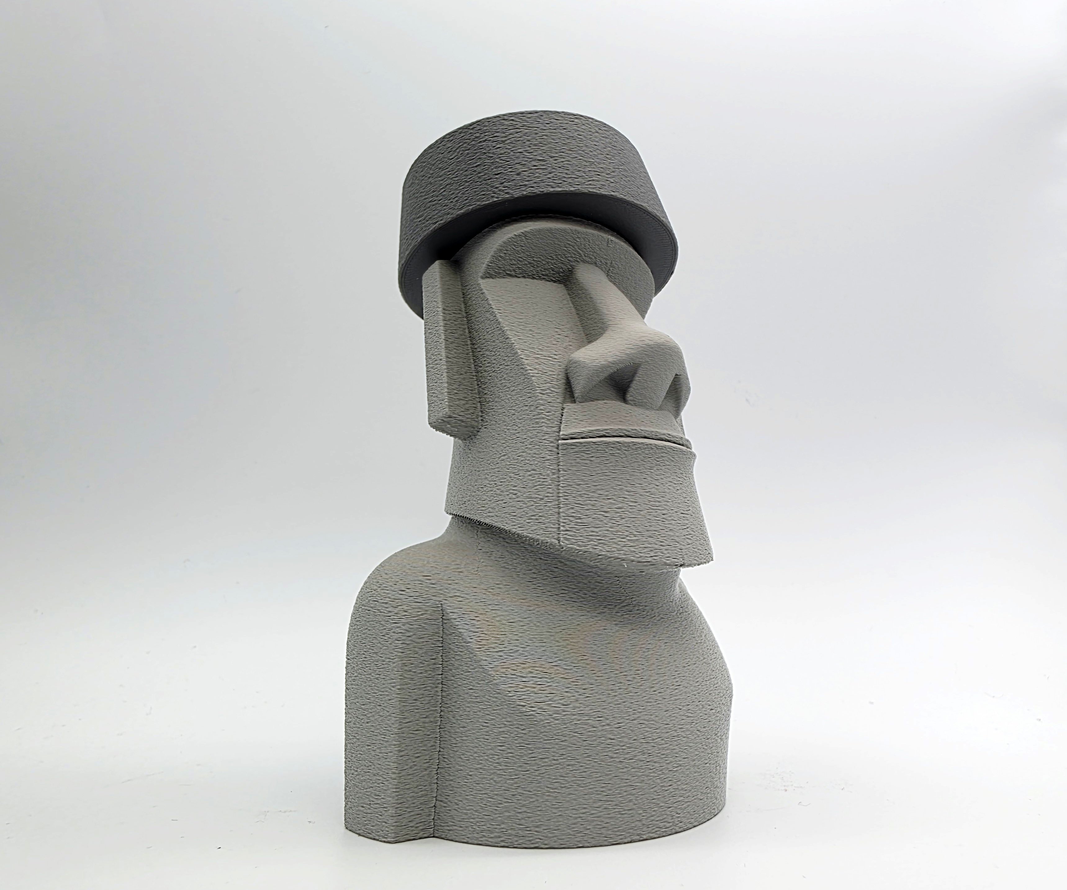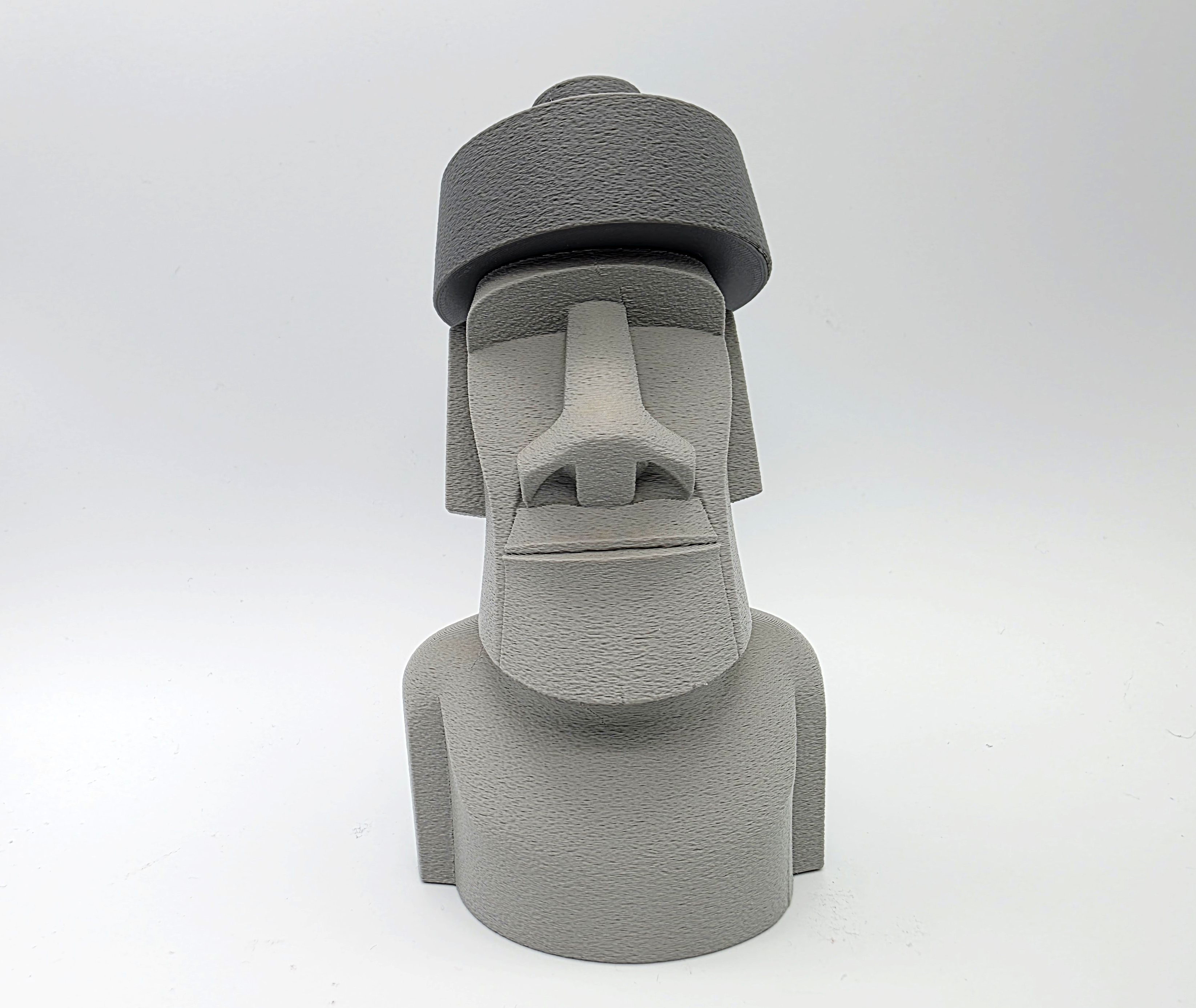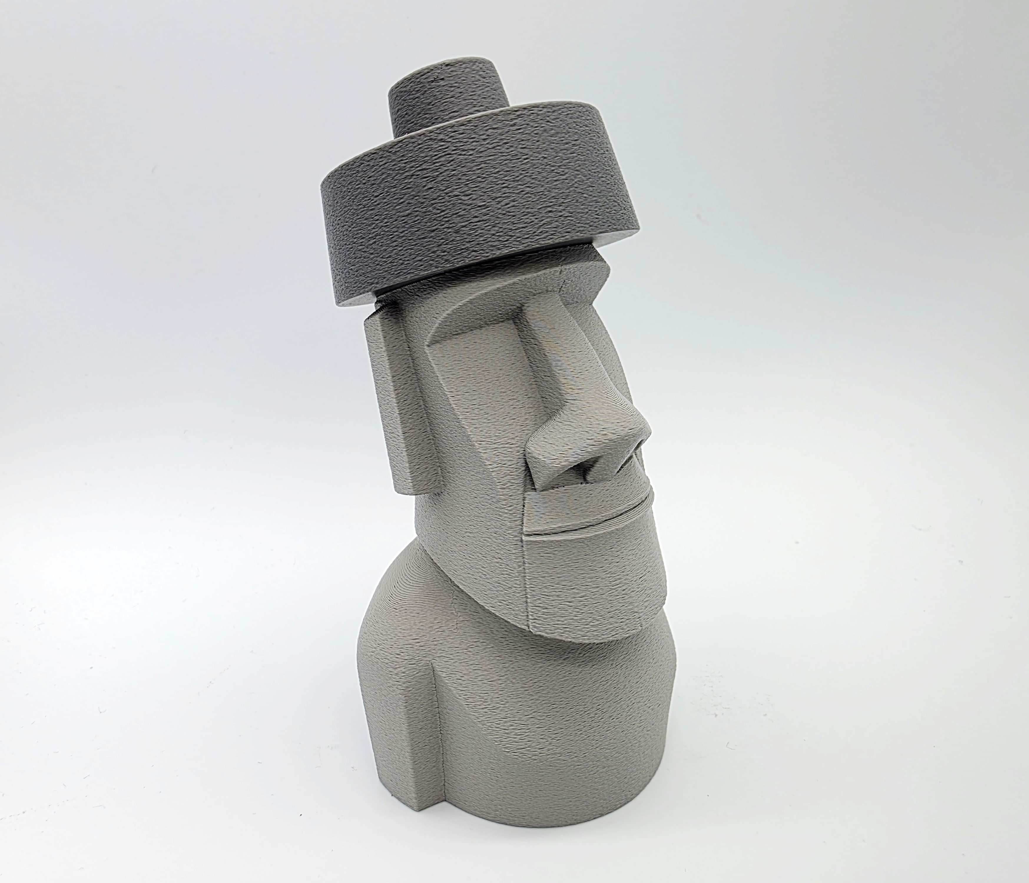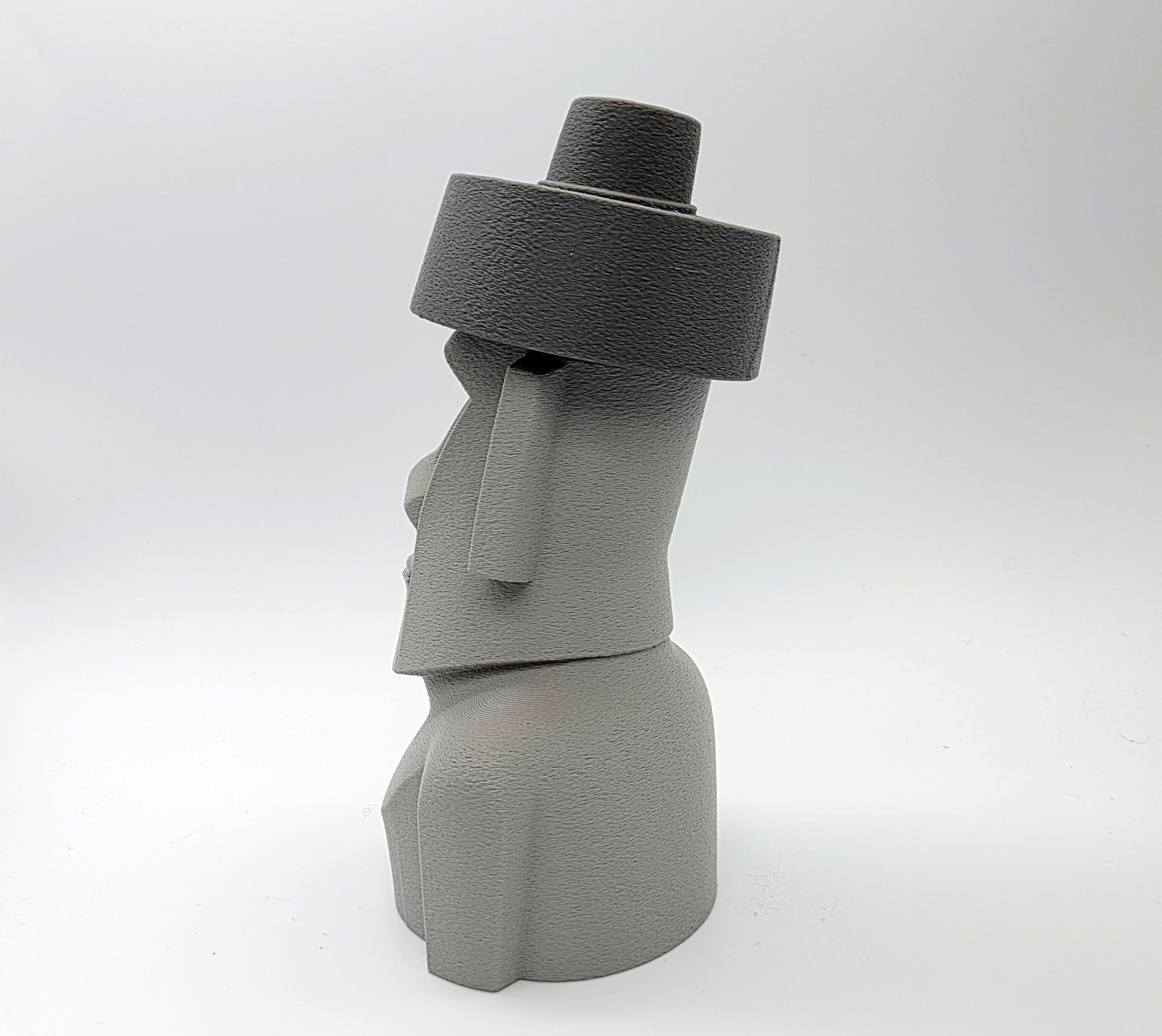 Mẫu Moai đội top knot (mũ) dạng 2 mảnh, lấy cảm hứng từ các tượng đầu đá thật trên đảo Phục Sinh. File 3mf có negative space ở phần top knot/hat để lắp khít; khuyên dùng Tree Supports trên build plate.