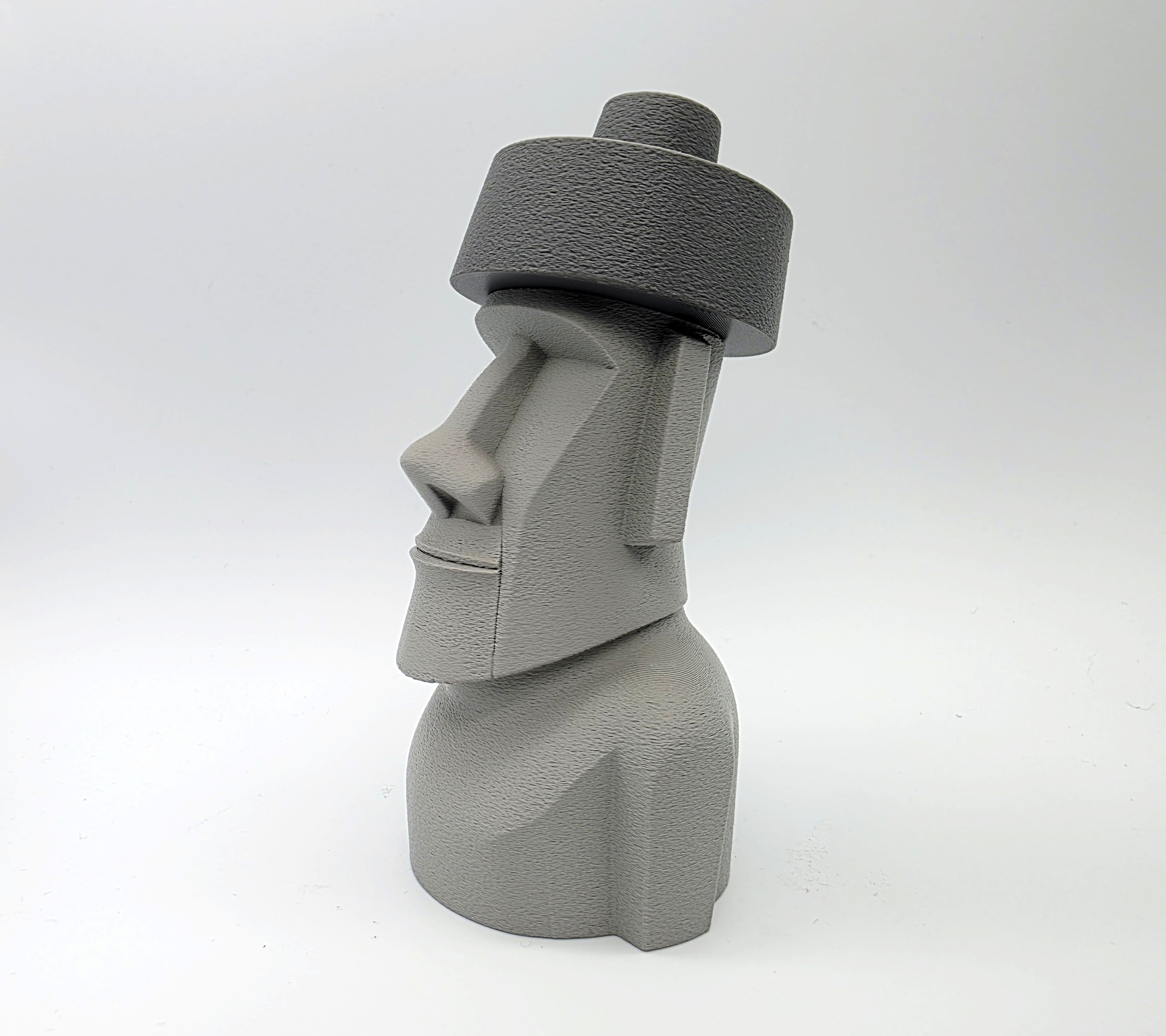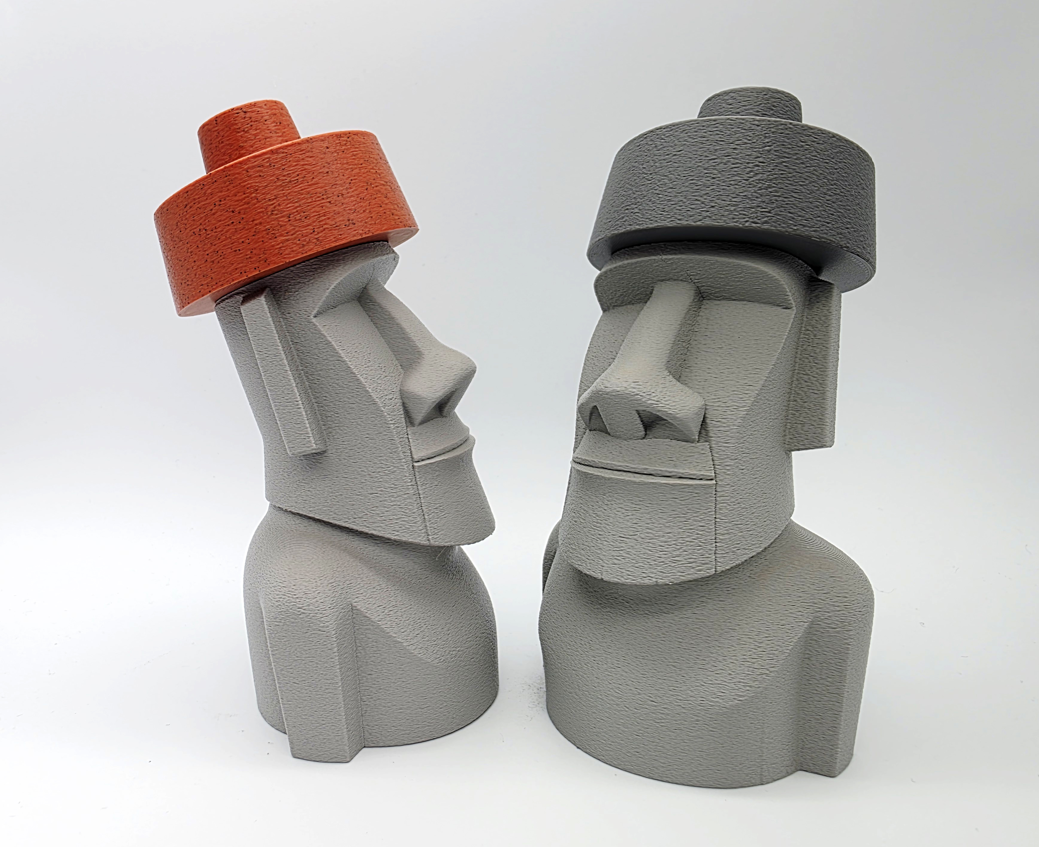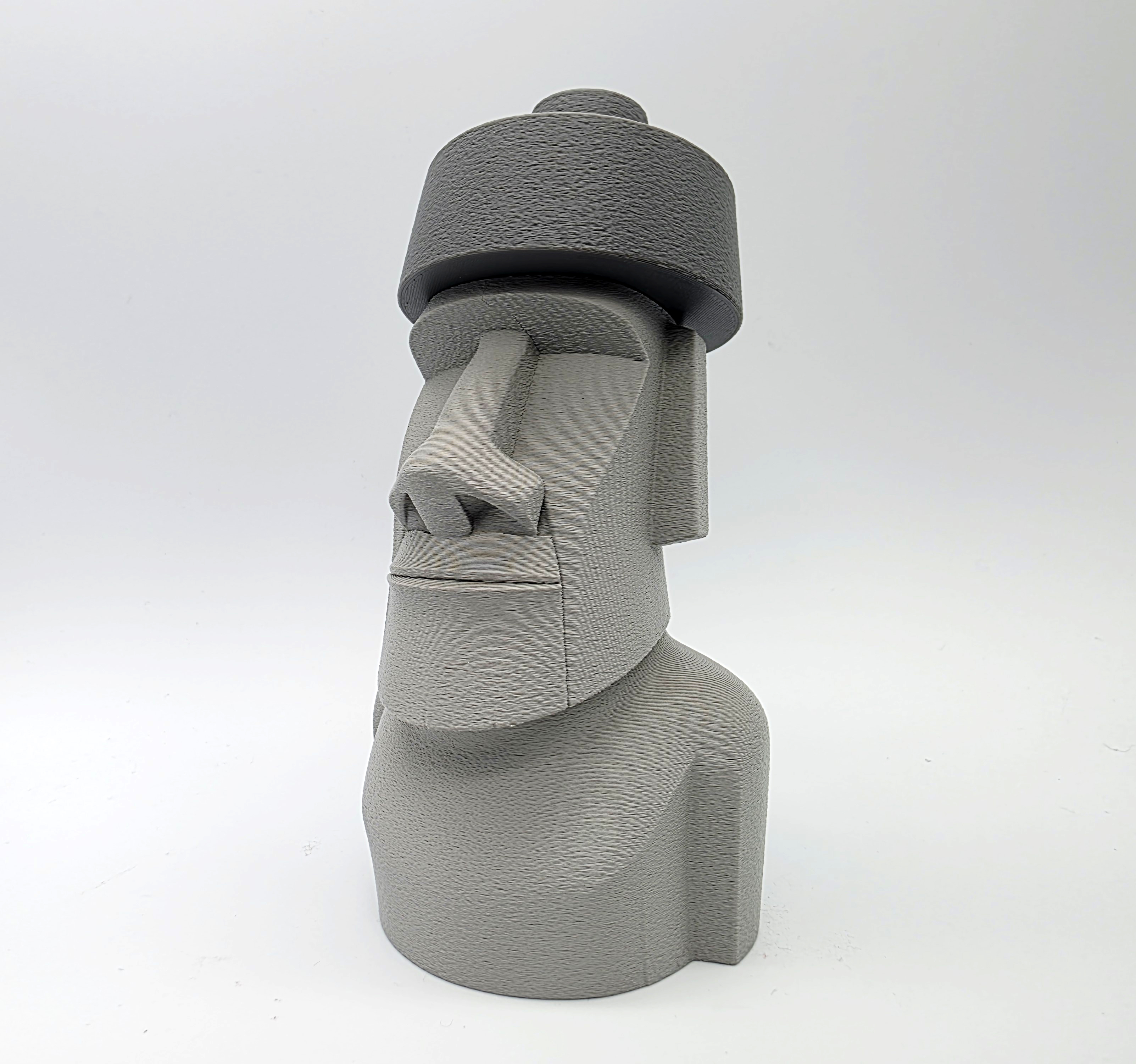 Mẫu Moai đội top knot (mũ) dạng 2 mảnh, lấy cảm hứng từ các tượng đầu đá thật trên đảo Phục Sinh. File 3mf có negative space ở phần top knot/hat để lắp khít; khuyên dùng Tree Supports trên build plate.