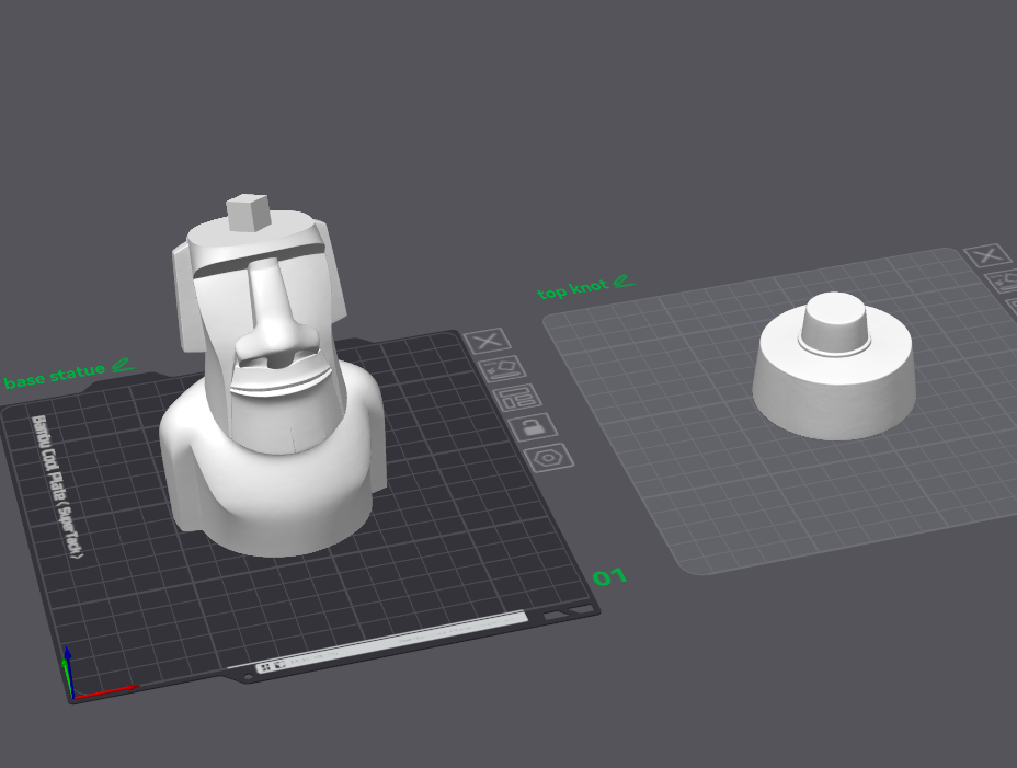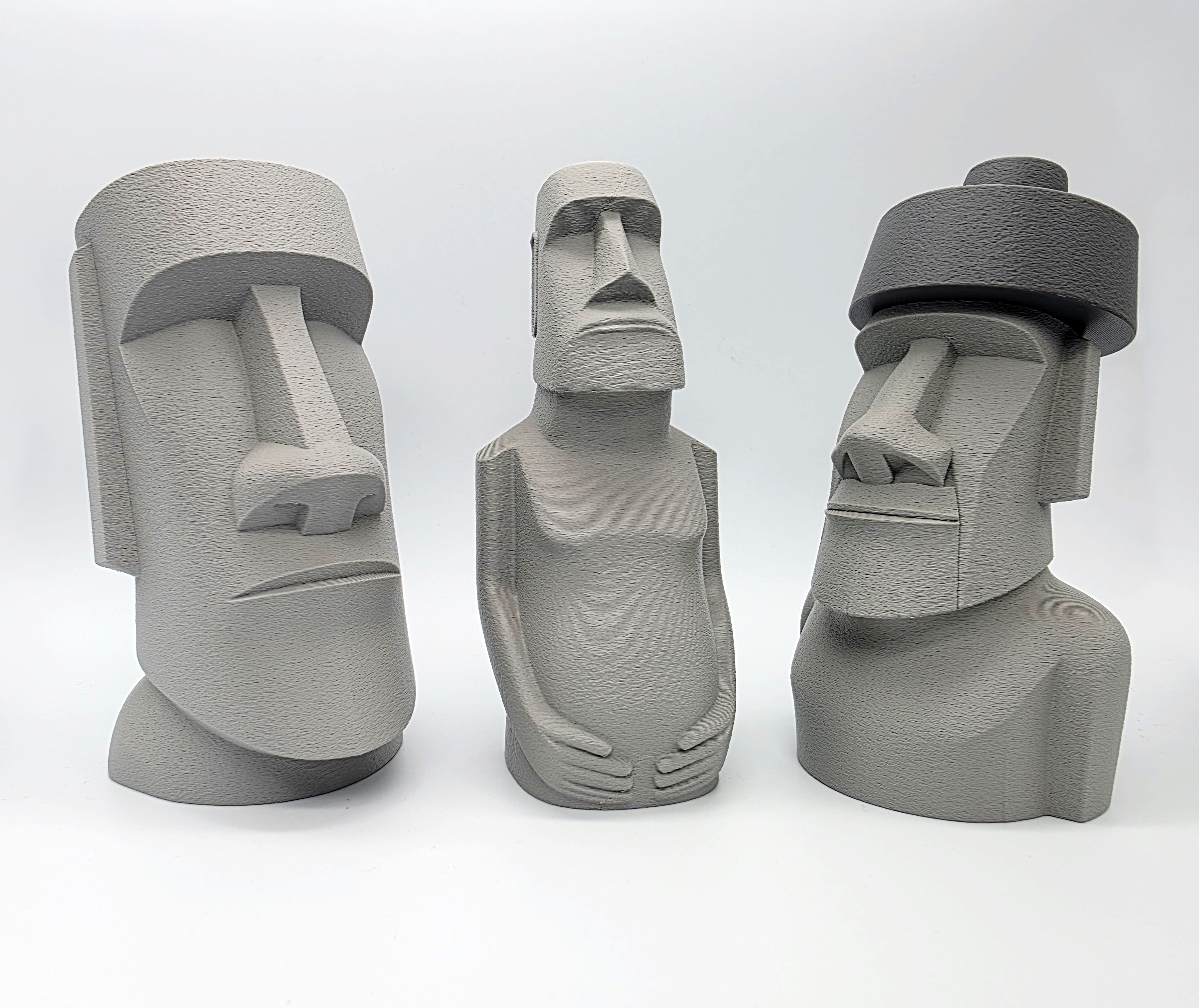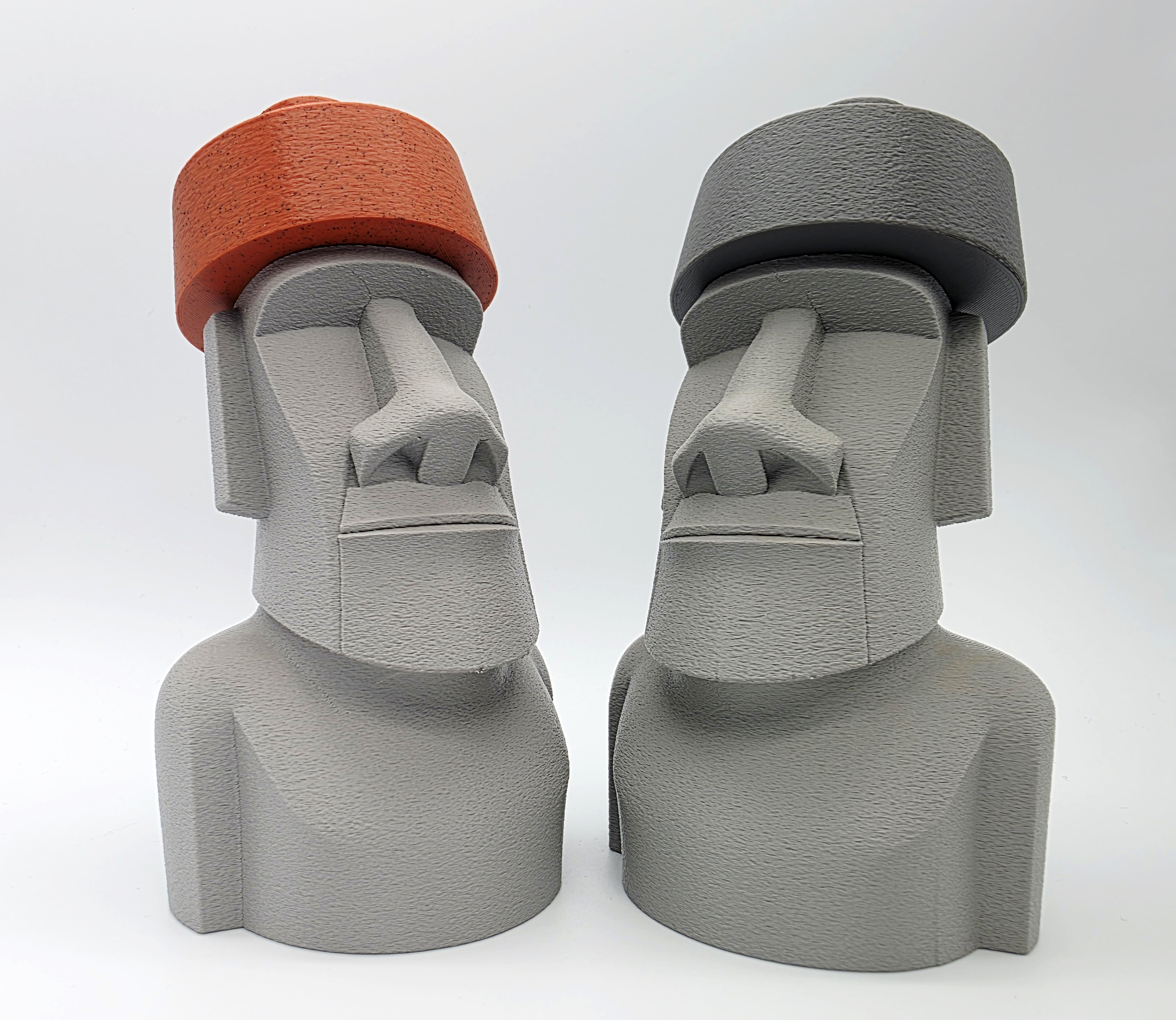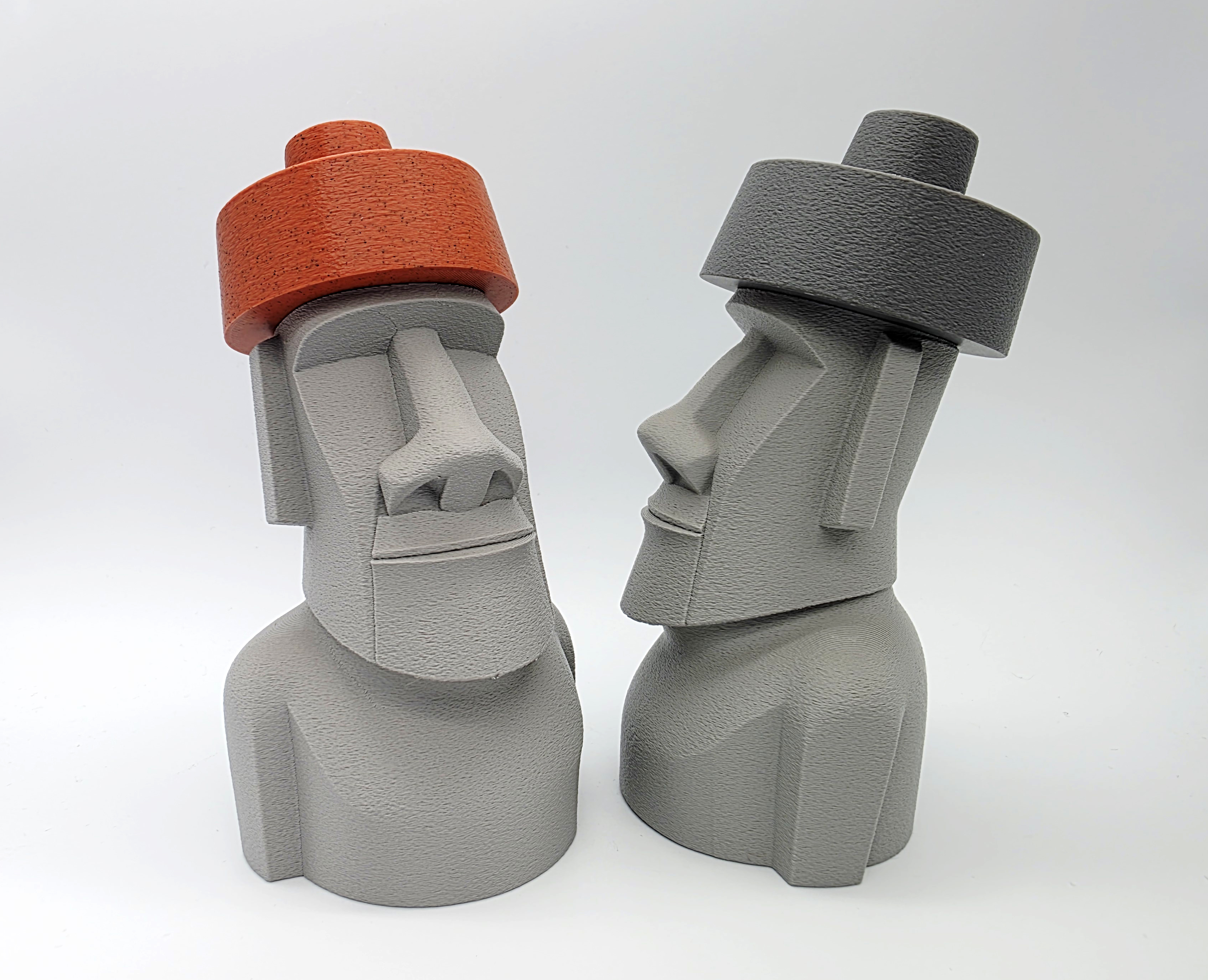 Mẫu Moai đội top knot (mũ) dạng 2 mảnh, lấy cảm hứng từ các tượng đầu đá thật trên đảo Phục Sinh. File 3mf có negative space ở phần top knot/hat để lắp khít; khuyên dùng Tree Supports trên build plate.