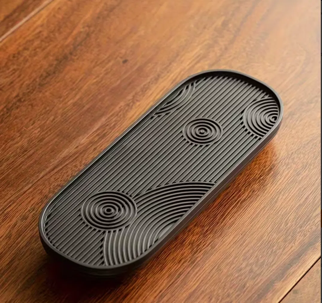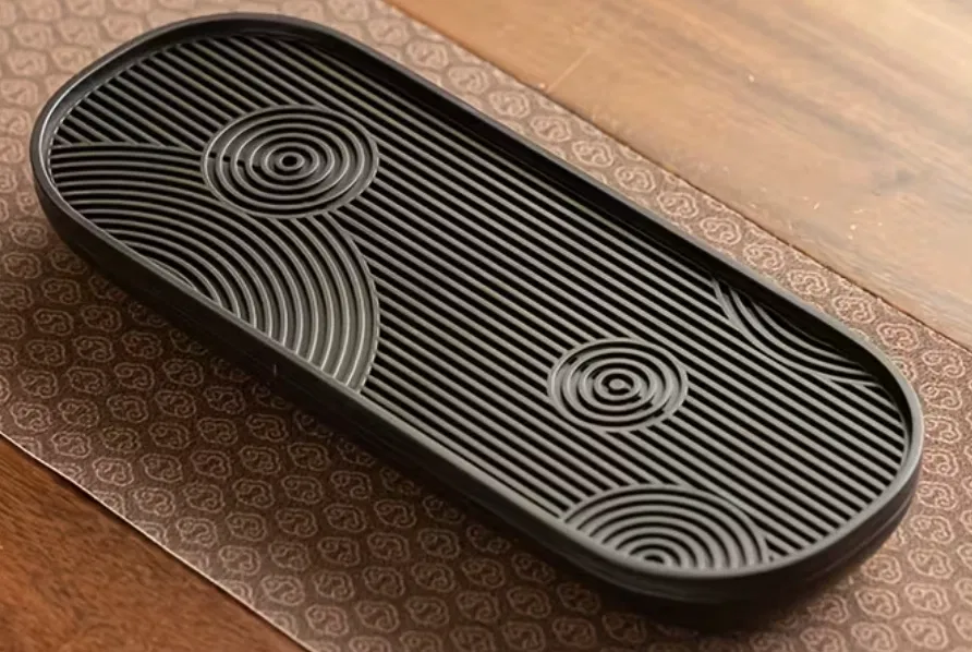 Khay trà Gongfu Cha dáng oval dài, bo tròn mượt, họa tiết rãnh thẳng và vòng tròn đồng tâm giúp dẫn nước/trà dư gọn gàng. Model tối ưu cho in 3D trên FDM, dùng làm khay khô hoặc tùy setup thoát nước.