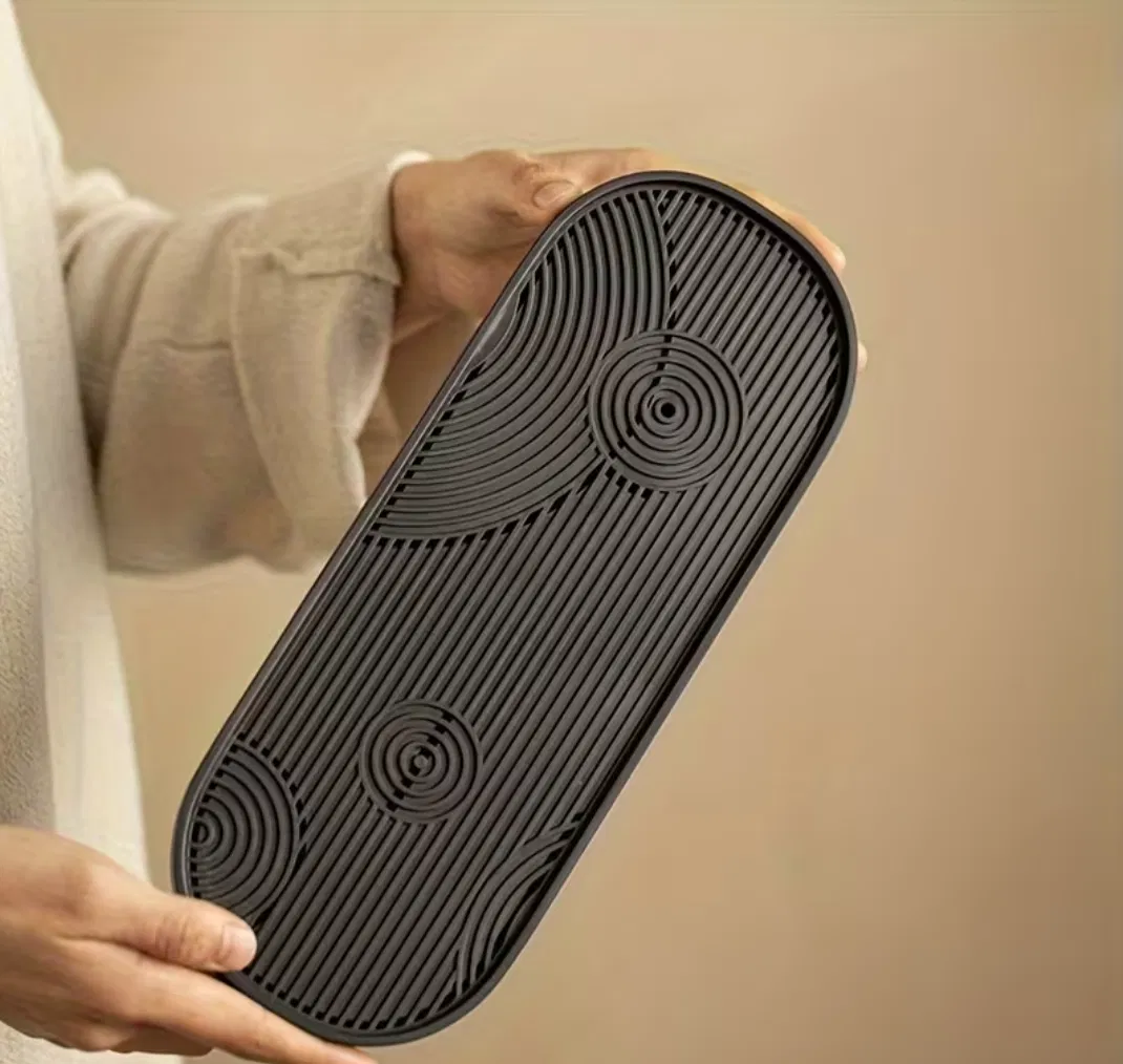 Đây là một khay trà Gongfu Cha phong cách hiện đại, thiết kế để pha trà tiện dụng và nhìn gọn đẹp. Khay có dáng oval dài với các cạnh bo tròn mượt, kèm họa tiết bề mặt tích hợp gồm các rãnh thẳng và vòng tròn đồng tâm, lấy cảm hứng từ những yếu tố thiết kế truyền thống Trung Hoa.