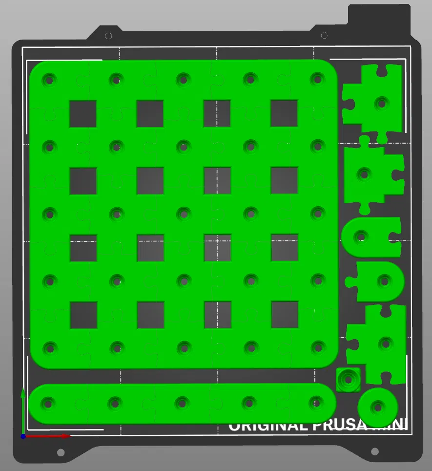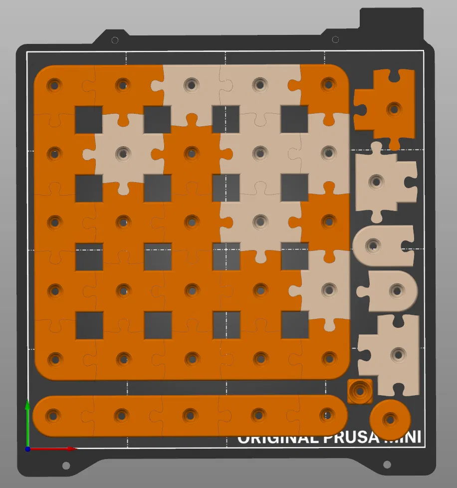 Mẫu này được tạo để in trên Prusa Mini và tất cả các mảnh (kể cả các mảnh in trùng nếu muốn làm hình vuông đầy đủ) đều sẽ vừa trên build plate—nhưng sẽ mất khoảng 17 tiếng nếu bật variable layer height. Mỗi mảnh riêng lẻ sẽ in khoảng 20–30 phút với 3 perimeters và 15% infill. Nếu bạn muốn một bố cục puzzle cụ thể, chỉ cần import các mảnh cần dùng, slice, in rồi xài thôi!