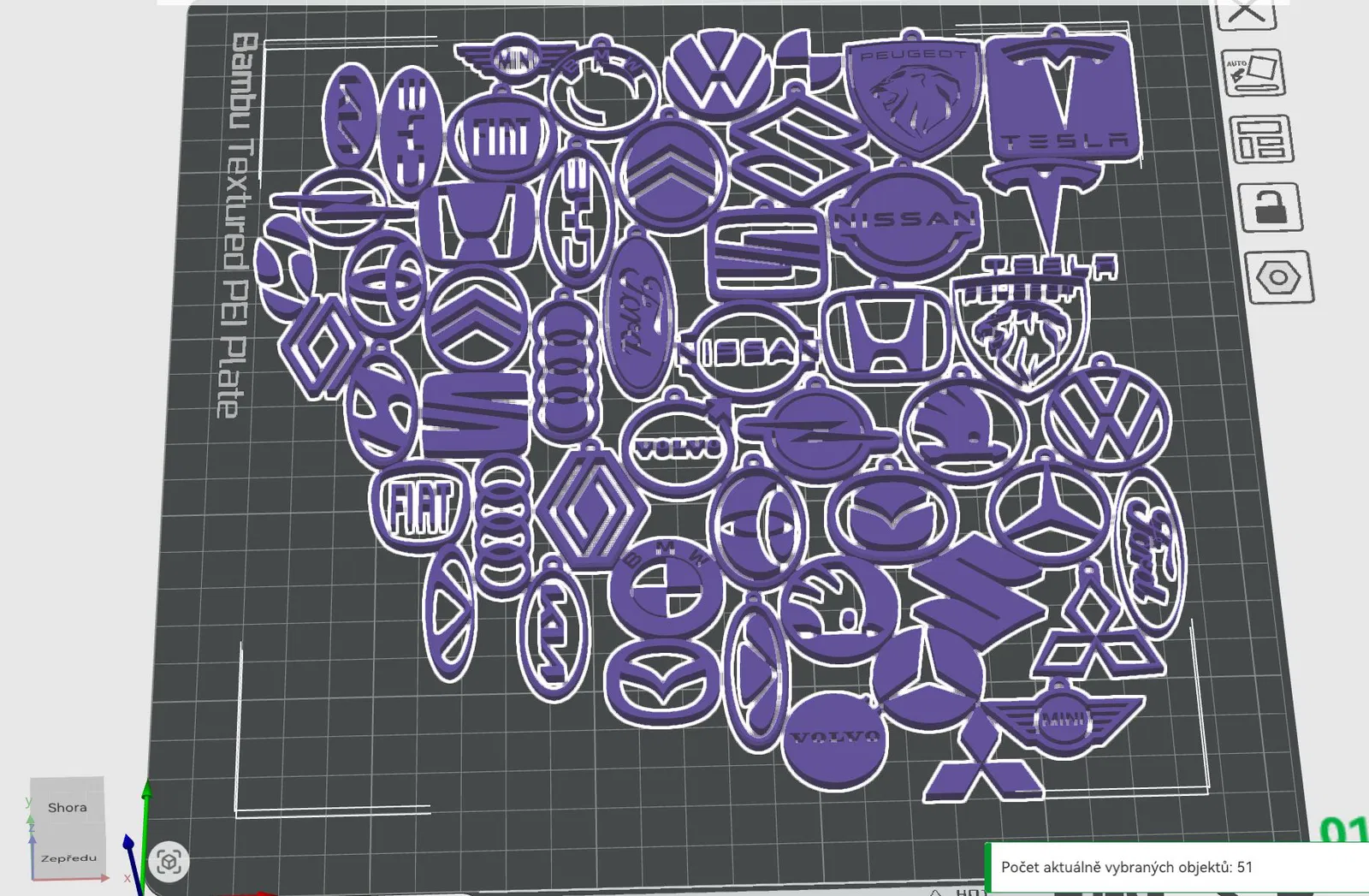 Mẫu “Klicenka logo aut” (klicenka, loga aut) gồm klicenka kèm logo 3D của nhiều hãng xe như Audi, BMW, Ford, Honda, Hyundai, Kia, Mercedes, Tesla, Toyota, Volkswagen, Volvo… phù hợp in 3D.