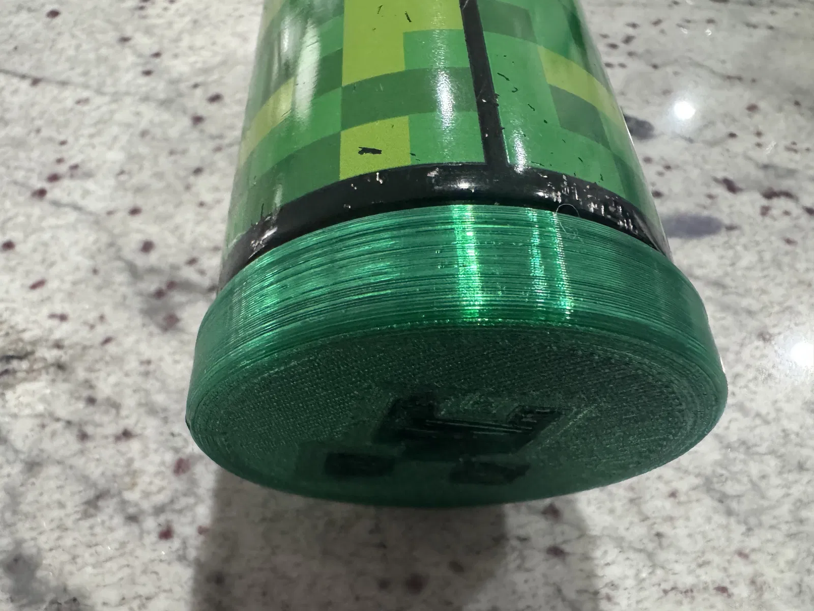 Nắp đáy thay thế in TPU cho bình nước Pottery Barn Mackenzie, mặt dưới có hoạ tiết creeper Minecraft. Thiết kế hơi undersize để ôm khít khi in TPU, nhưng nên dán thêm chút keo để giữ chắc.