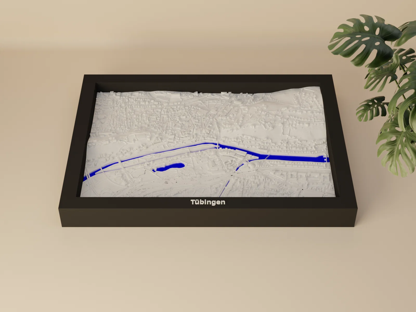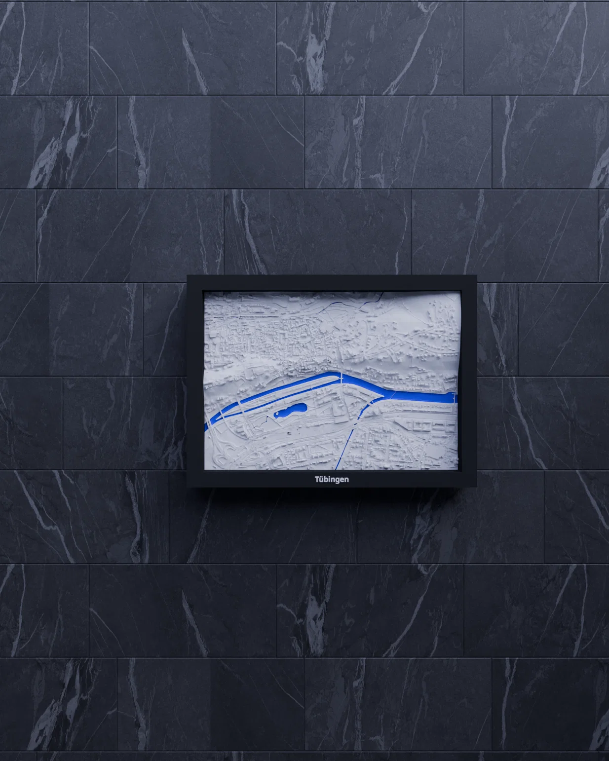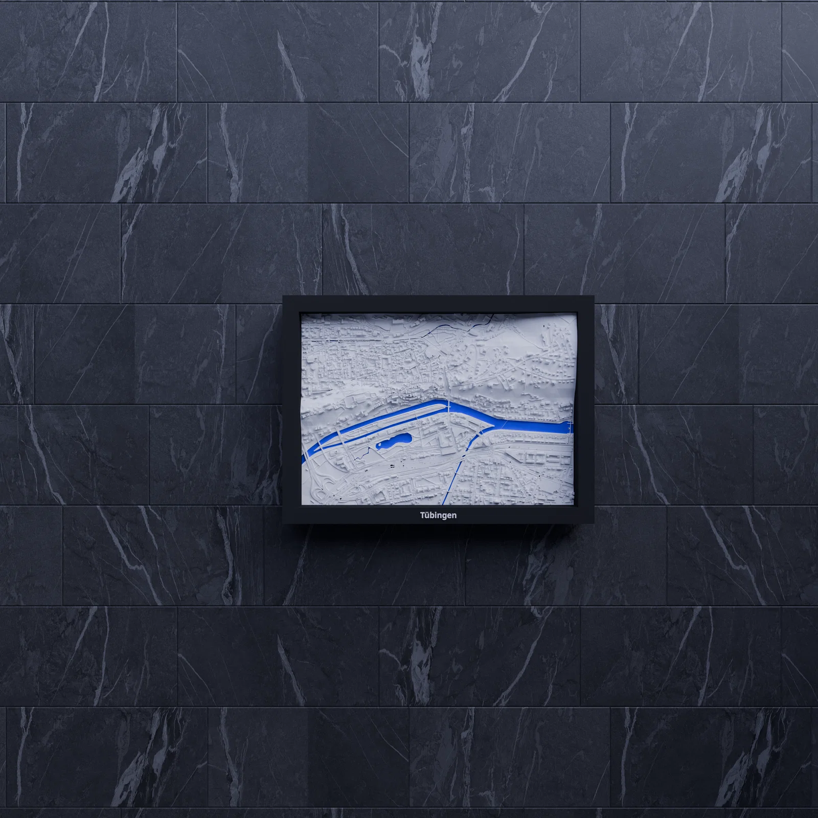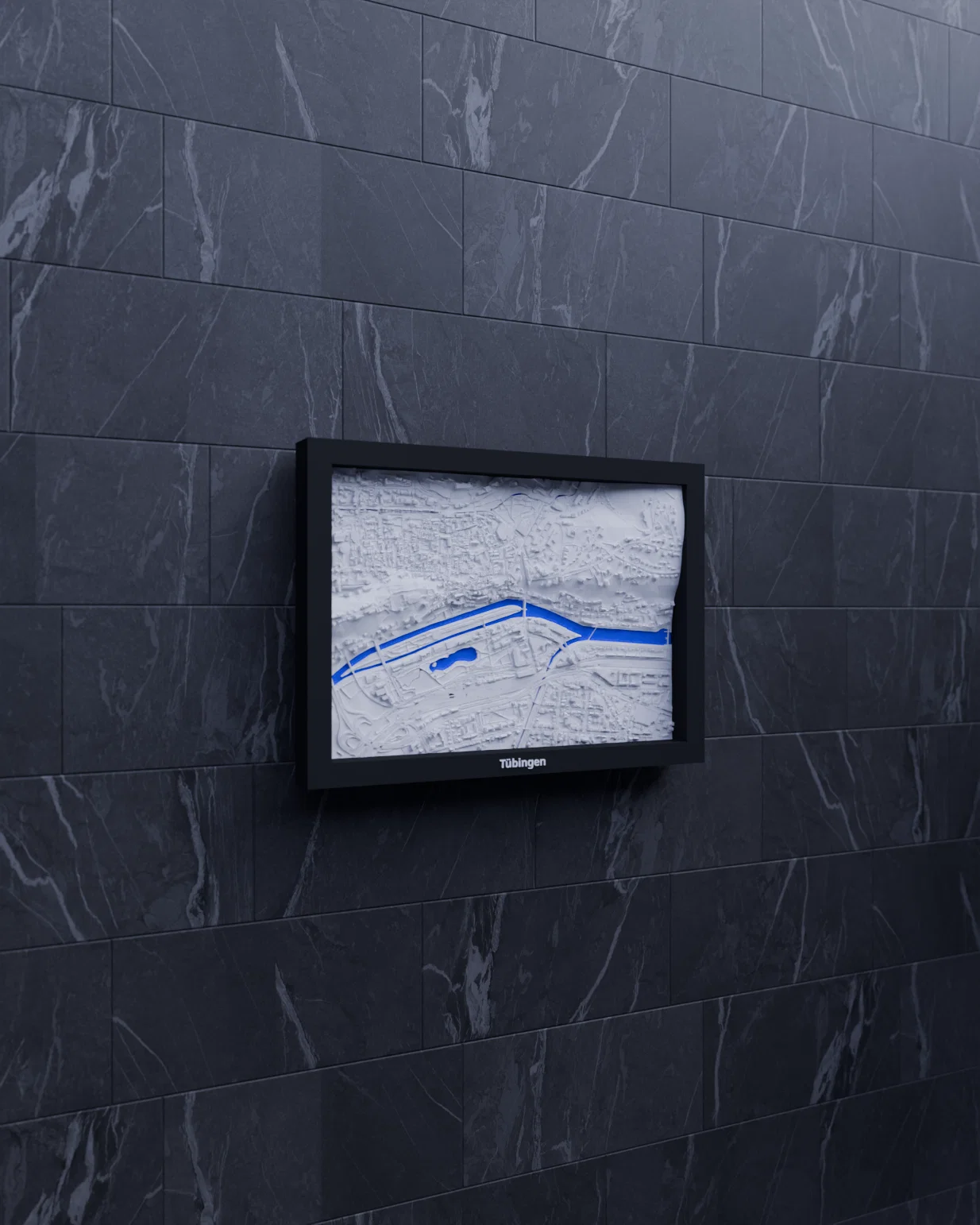 Mô hình địa hình thu nhỏ Tübingen (Đức) có thể in 3D, dựng từ dữ liệu địa lý để tái hiện terrain chân thật. Kèm nhiều frame treo tường, phù hợp học tập, trực quan hóa kiến trúc hoặc decor nhà.