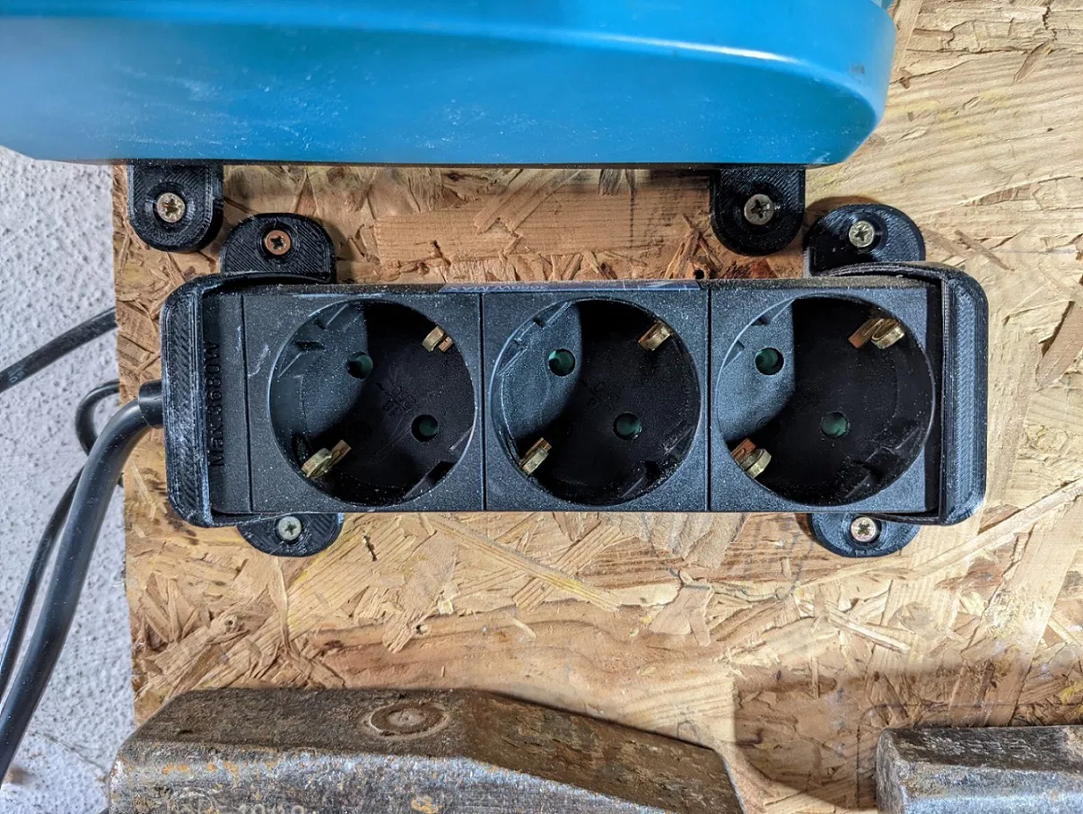 Bộ 2 bracket để bắt một extension cord/three-way adapter (ổ chia 3) lên tường hoặc trần. Dễ in, ít hao vật liệu, kẹp chắc chắn và không cần sửa đổi hay can thiệp vào extension cord.