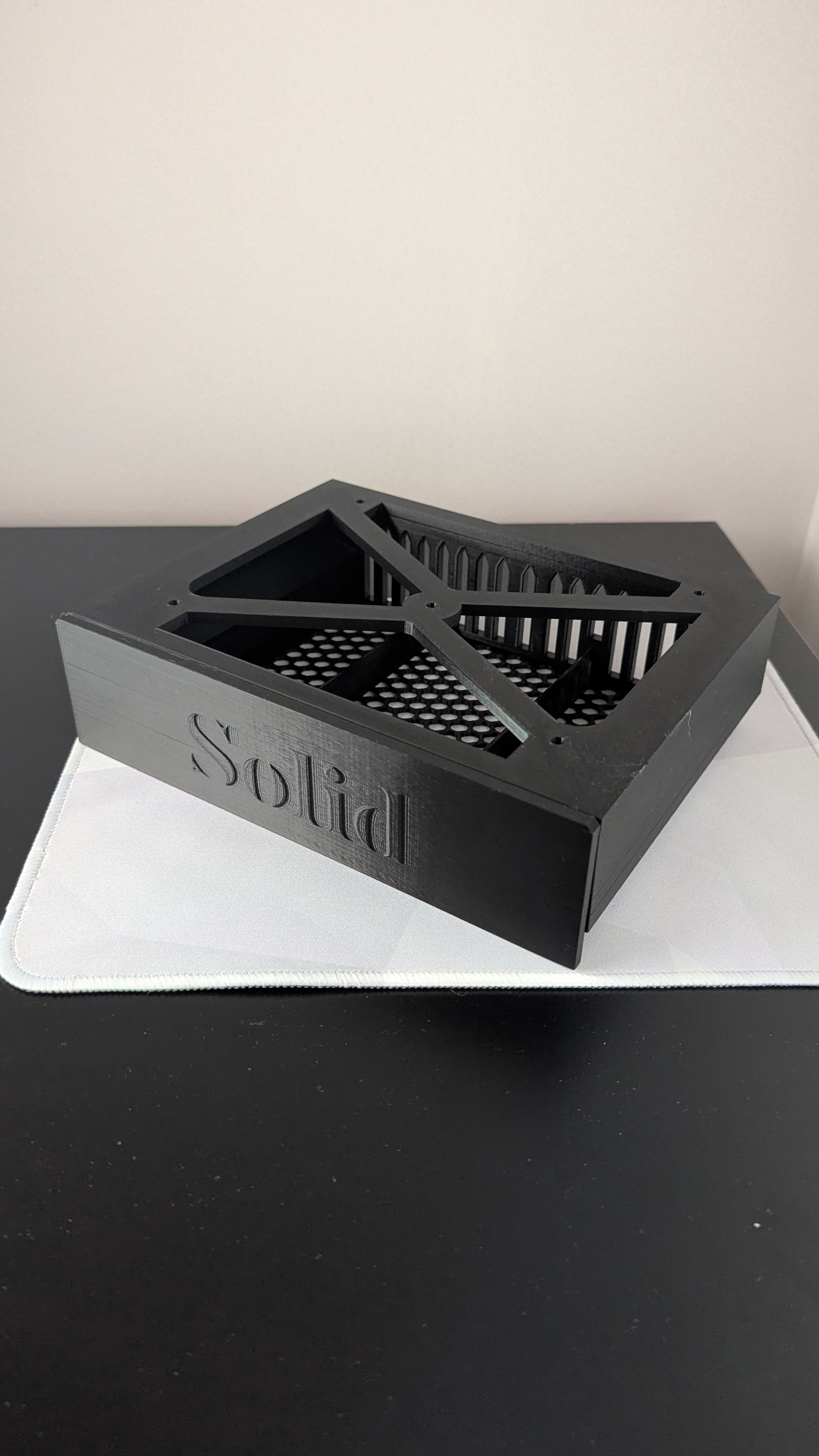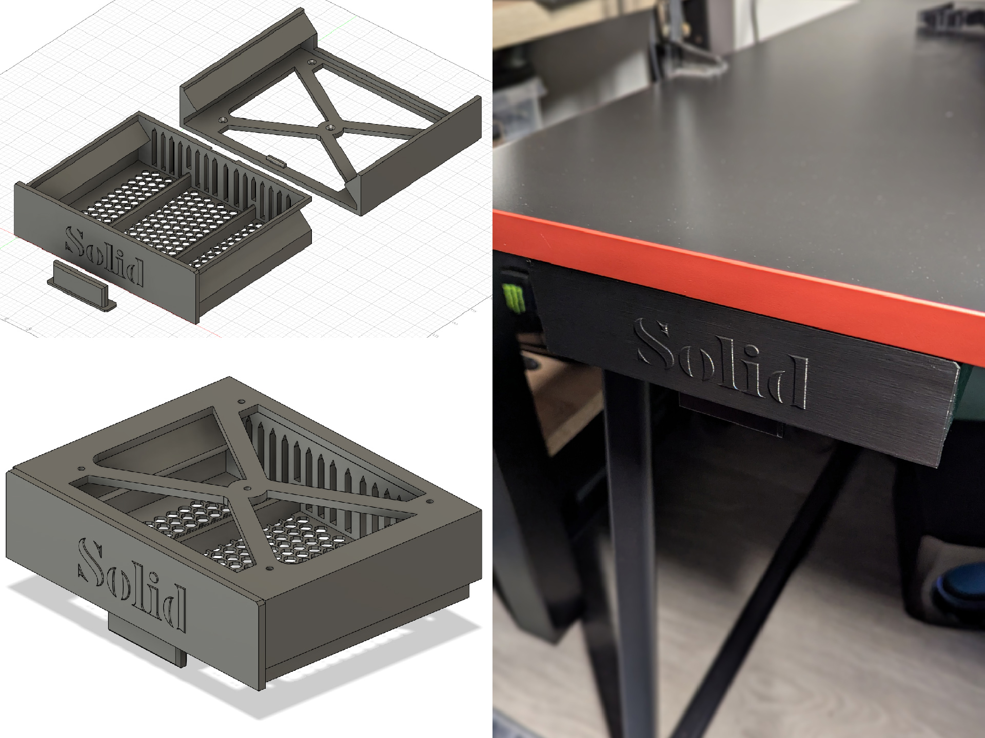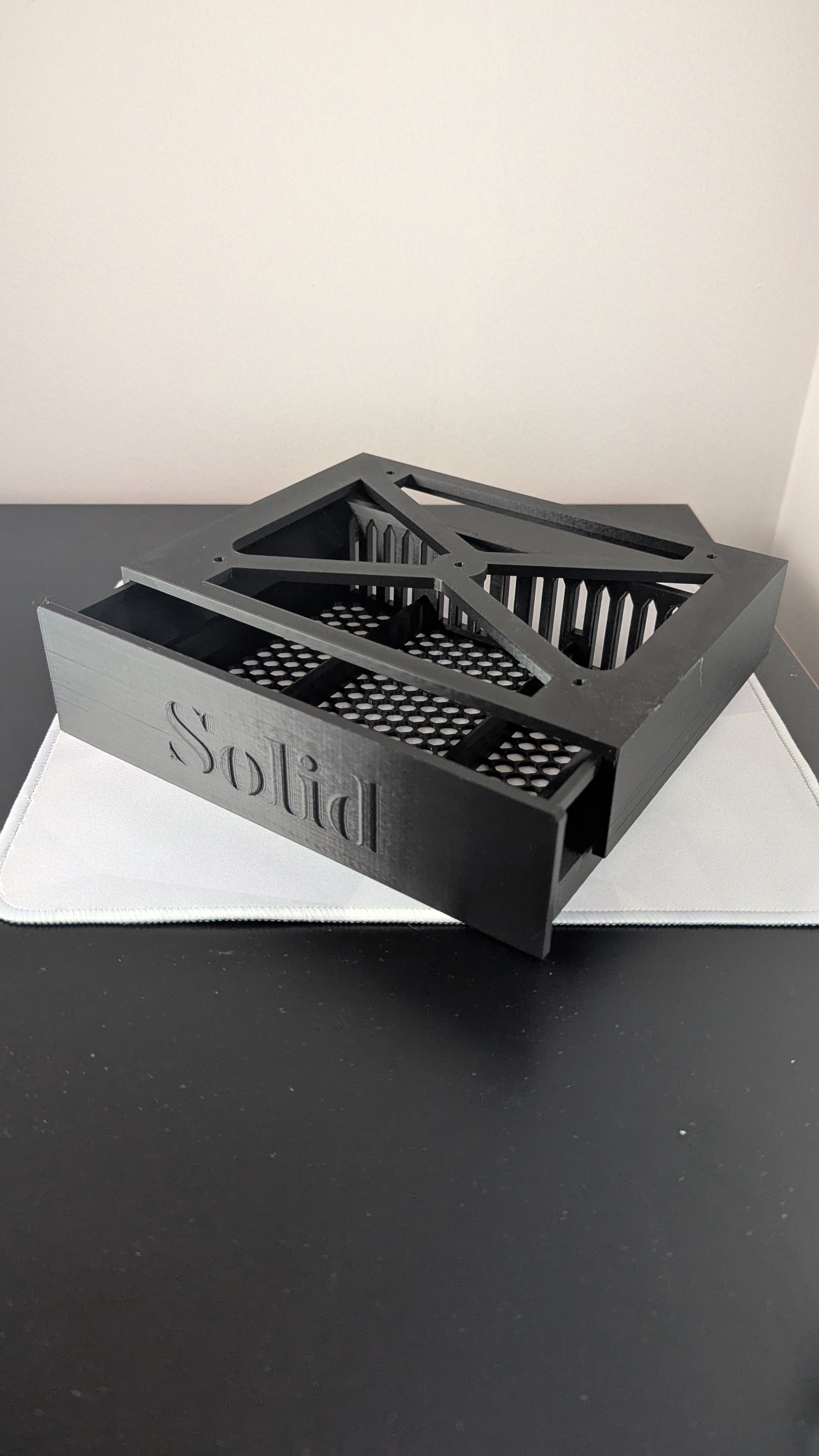 Ngăn kéo nhỏ tên thiết kế “Solid”, lắp dưới mặt bàn. Dài khoảng 16 cm, tối ưu để vừa gầm bàn gaming IKEA HUVUDSPELARE. In PLA, infill 15%, PRUSA i3 MK3 0.20mm SPEED, không cần supports.