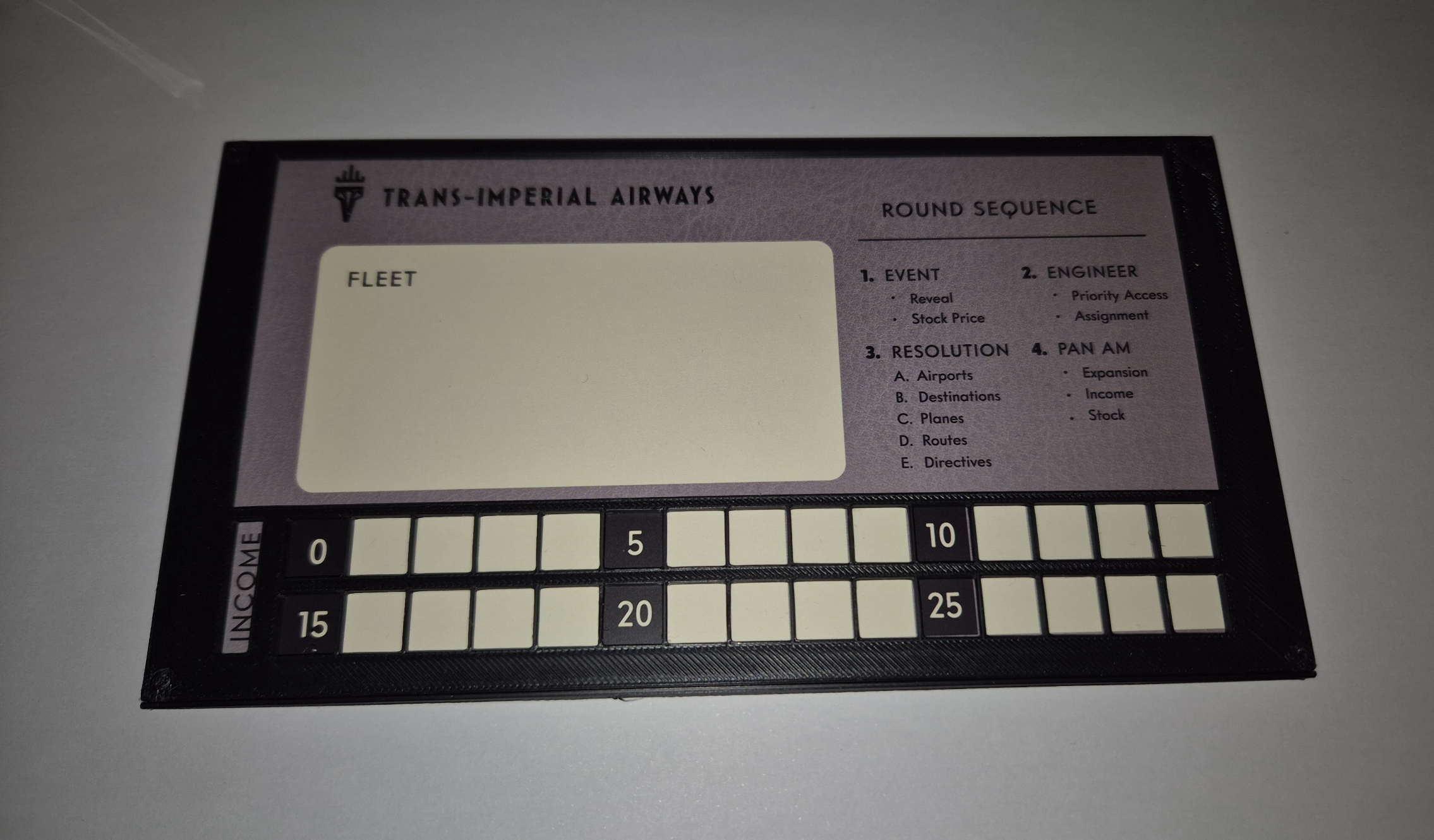 Nắp đậy cho bảng người chơi của game Pan Am. Giúp đảm bảo marker của người chơi không bị xê dịch trên board. In gồm 2 phần.