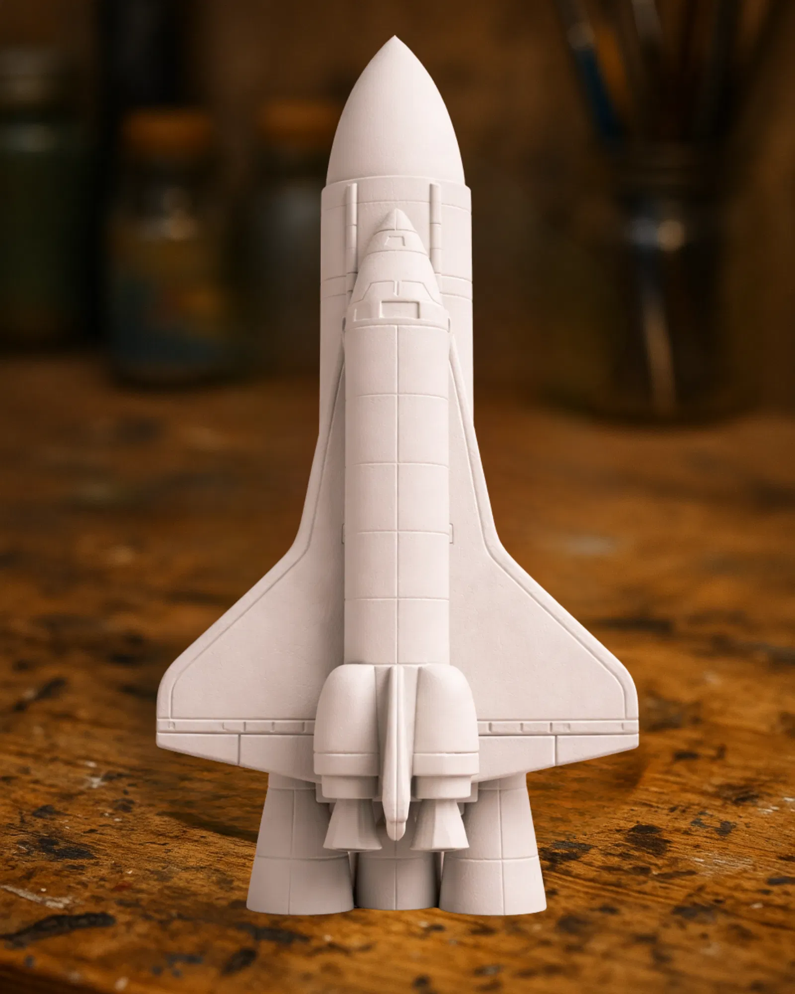 Một mô hình tượng Space Shuttle Rocket phong cách tối giản, sạch sẽ, với thiết kế điêu khắc mượt mà và tỷ lệ cân đối.